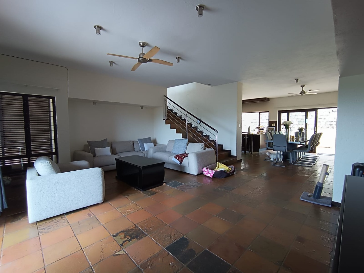 Discover this modern multi-level residence nestled in a suburban complex within Nelspruit Ext 11. Boasting a contemporary architectural style with a light beige exterior and private garages, the property presents an inviting first impression. Step inside to an expansive open-plan living and dining area, designed for seamless flow and abundant natural light. A prominent modern staircase serves as a stylish focal point, connecting the distinct living spaces across multiple levels. Ceiling fans and air conditioning ensure comfort throughout the year, complementing the spacious 270 sqm floor size.