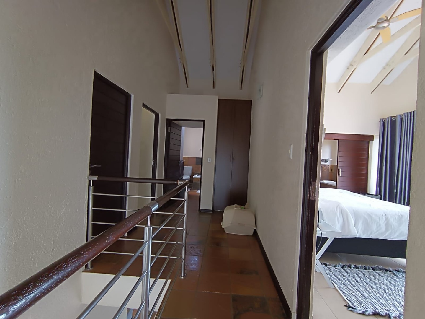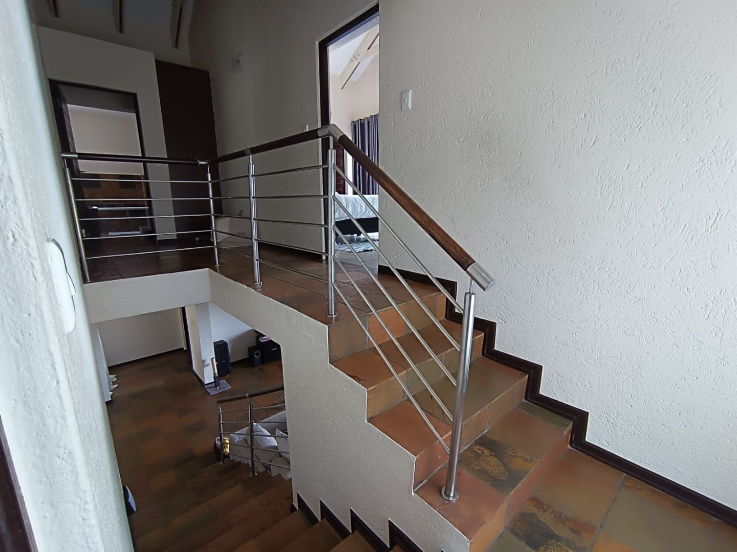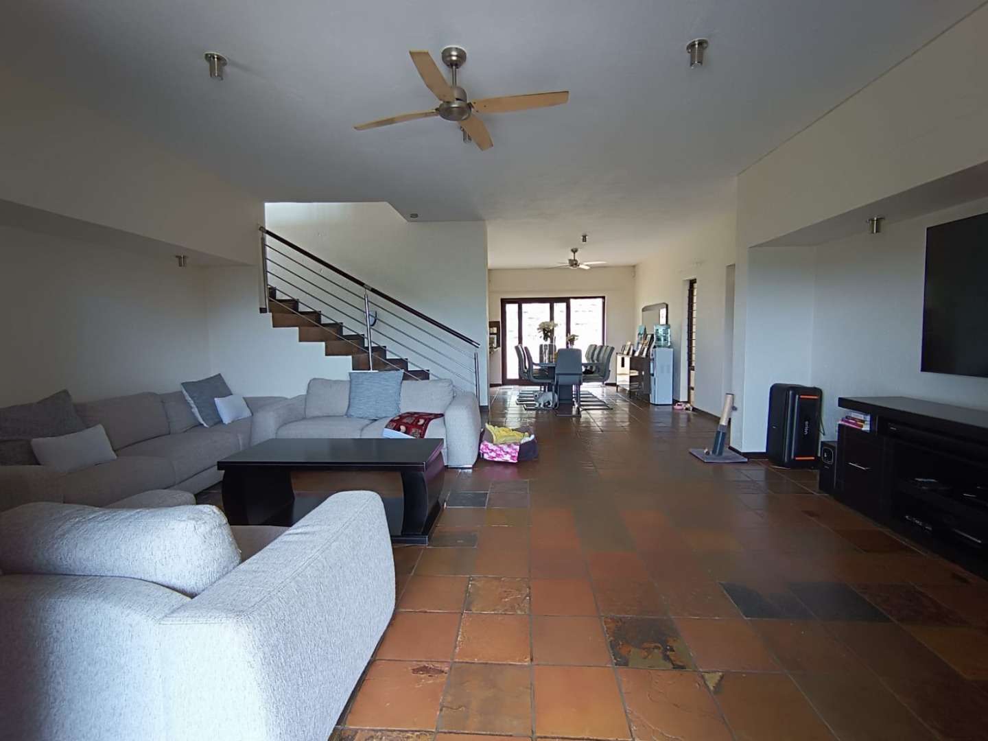 Discover this modern multi-level residence nestled in a suburban complex within Nelspruit Ext 11. Boasting a contemporary architectural style with a light beige exterior and private garages, the property presents an inviting first impression. Step inside to an expansive open-plan living and dining area, designed for seamless flow and abundant natural light. A prominent modern staircase serves as a stylish focal point, connecting the distinct living spaces across multiple levels. Ceiling fans and air conditioning ensure comfort throughout the year, complementing the spacious 270 sqm floor size.