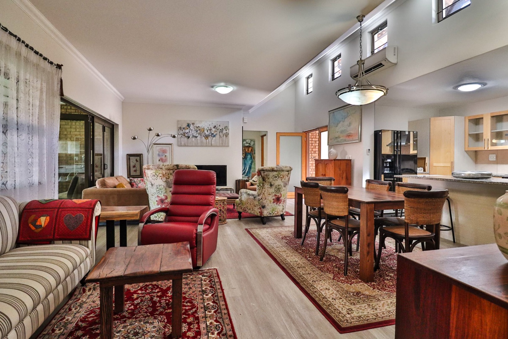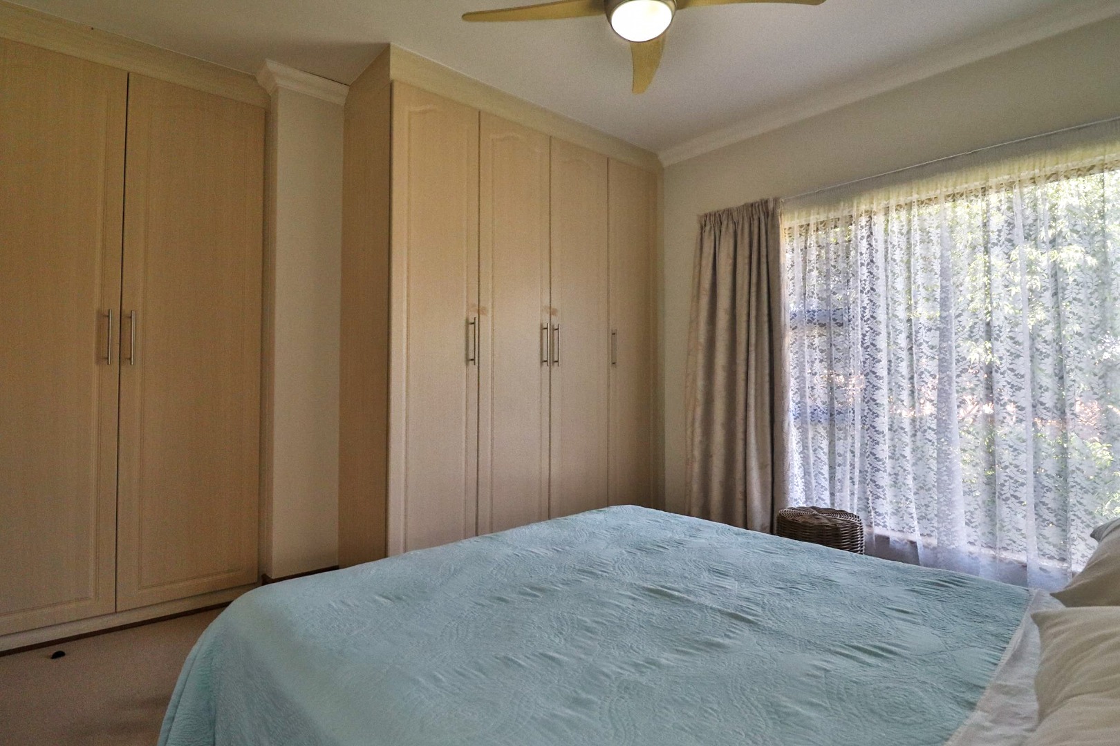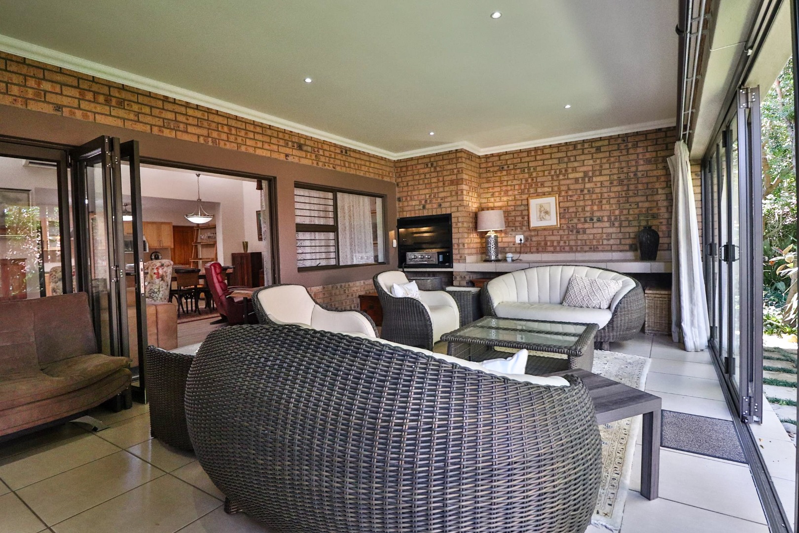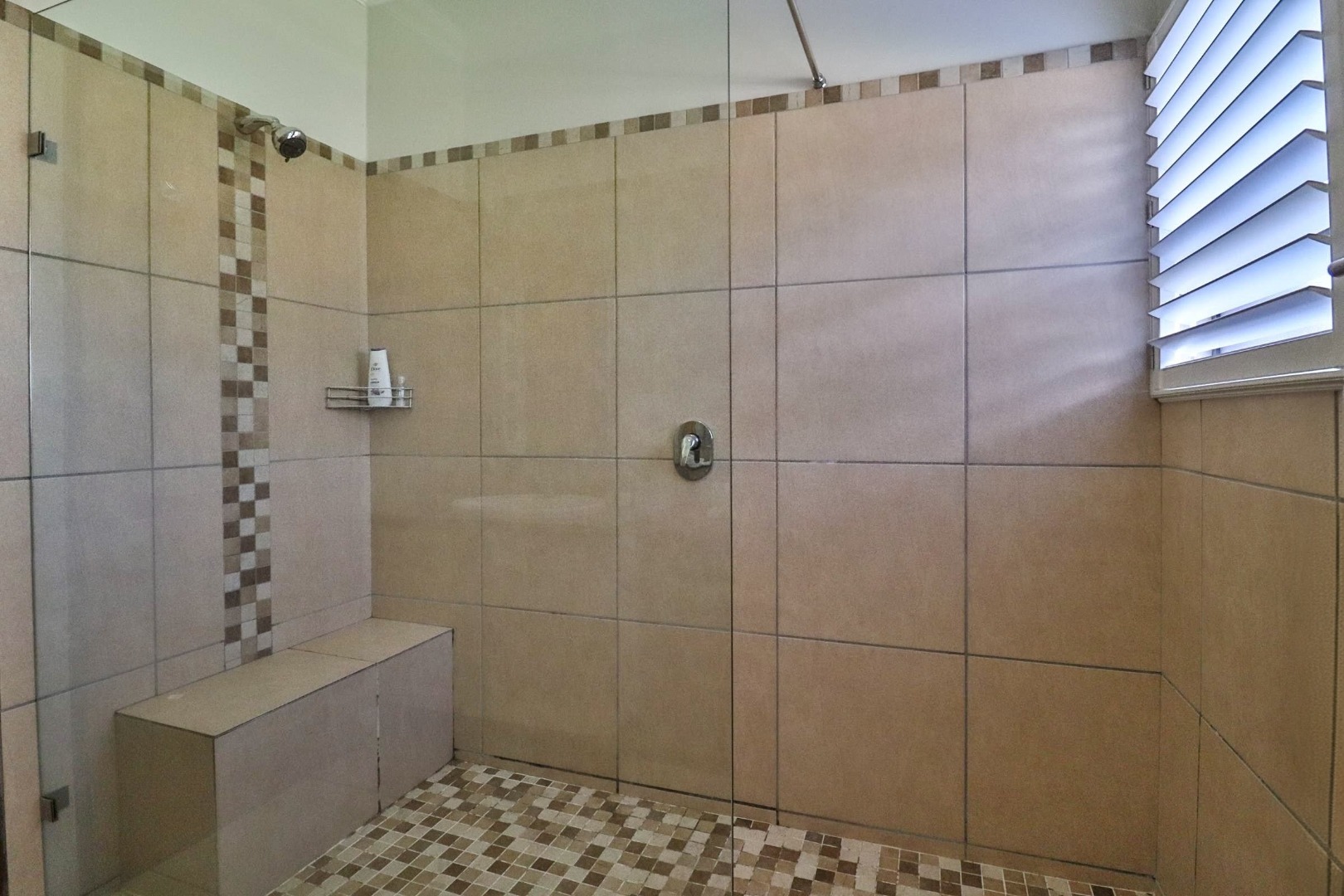 walk in shower and bath, the second bathroom has a bath and shower. The patio is enclosed with stack doors has a gas braai and can accommodate a dining and seating area. The house has a double garage, stunning garden, inverter, aircons and fans, shutters and blinds