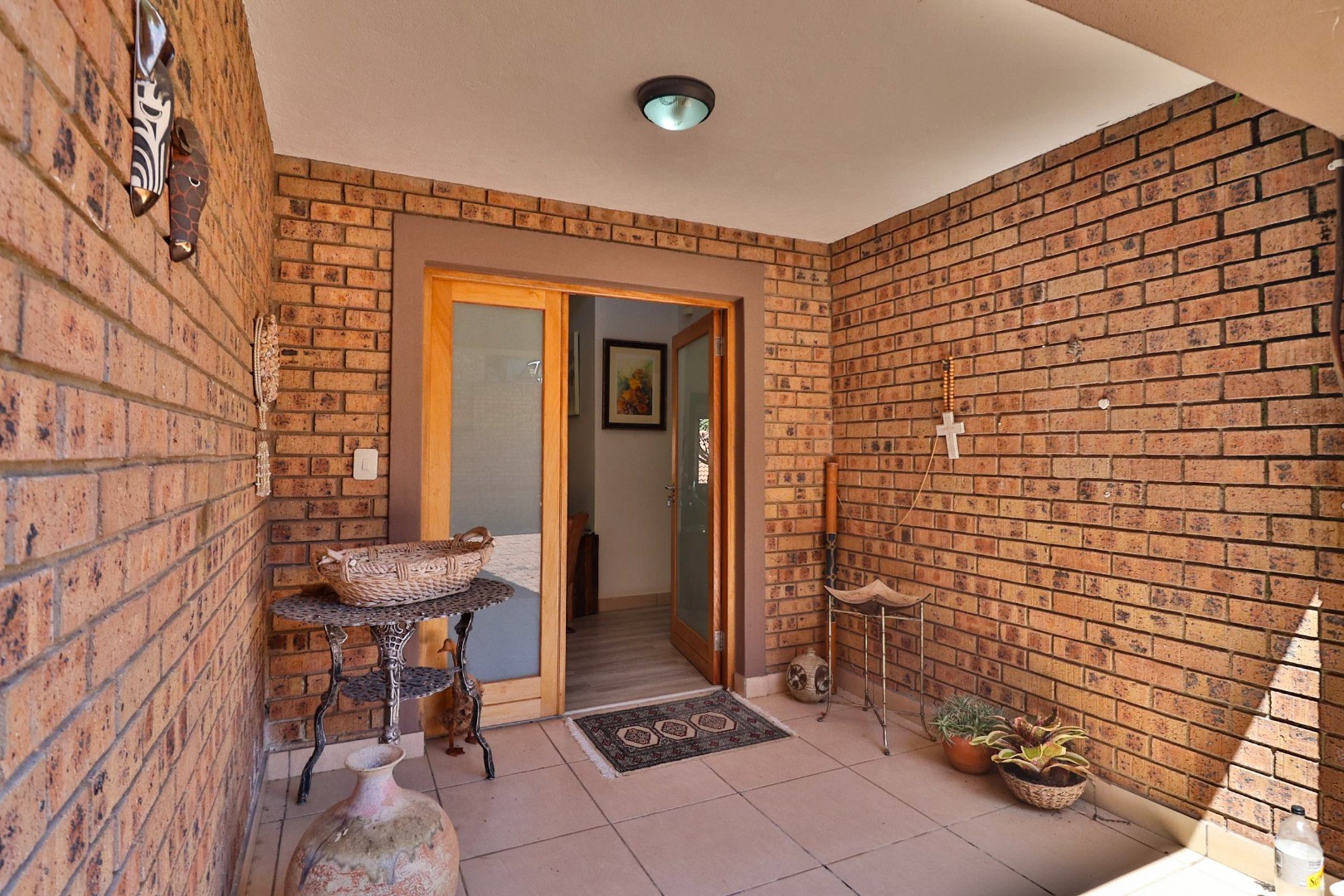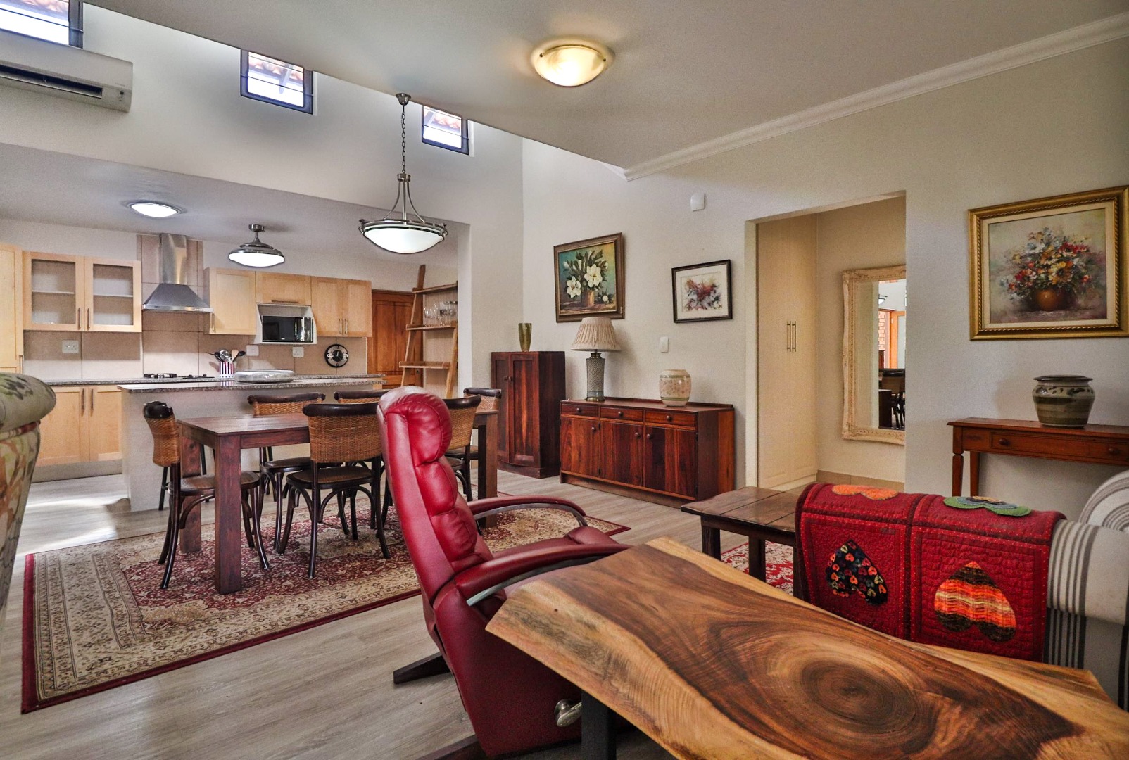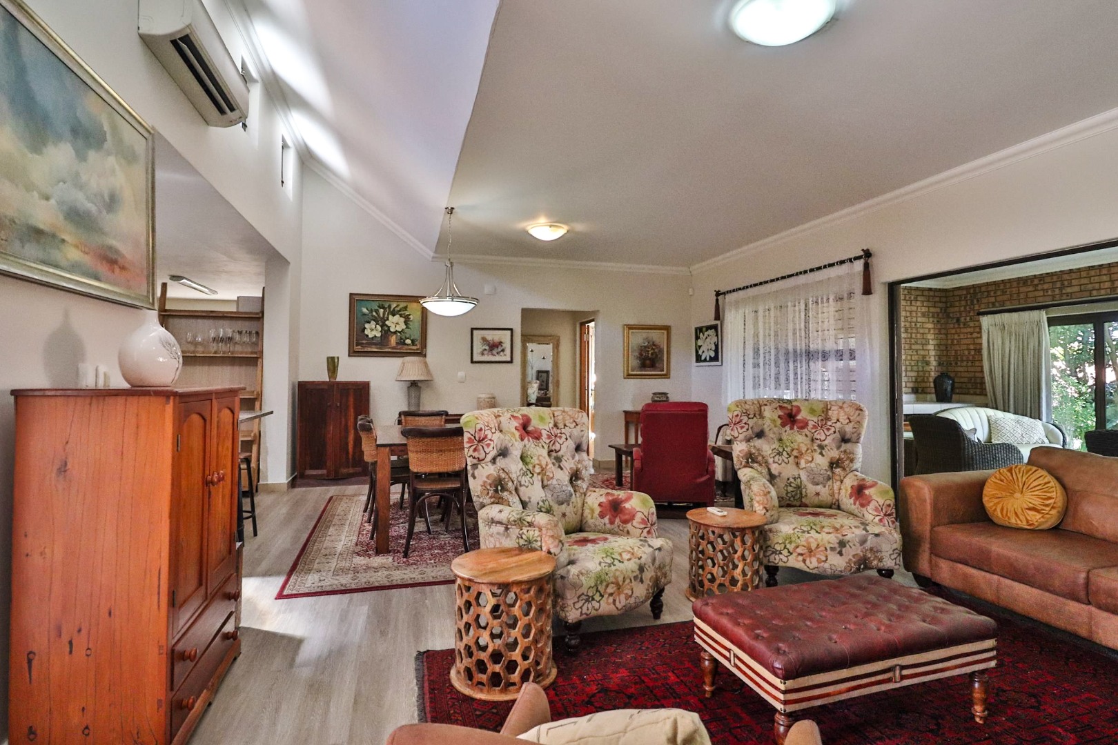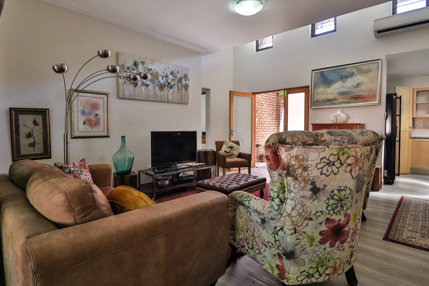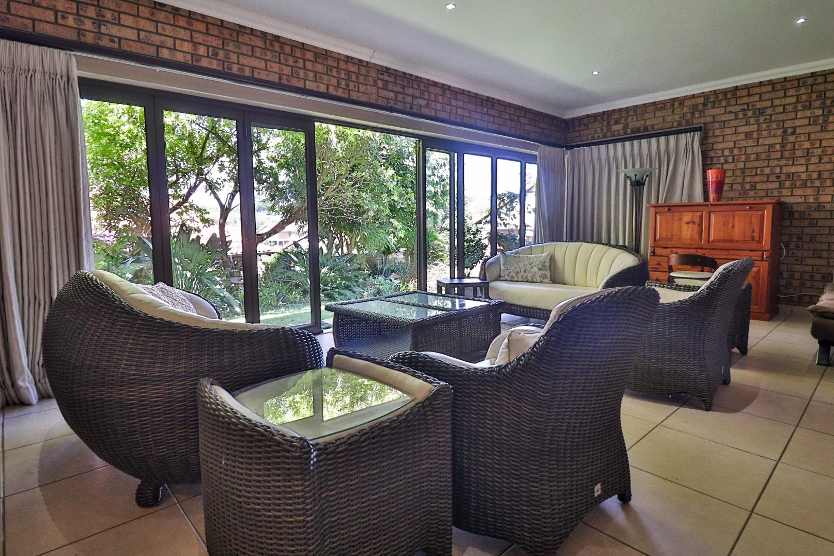 walk in shower and bath, the second bathroom has a bath and shower. The patio is enclosed with stack doors has a gas braai and can accommodate a dining and seating area. The house has a double garage, stunning garden, inverter, aircons and fans, shutters and blinds