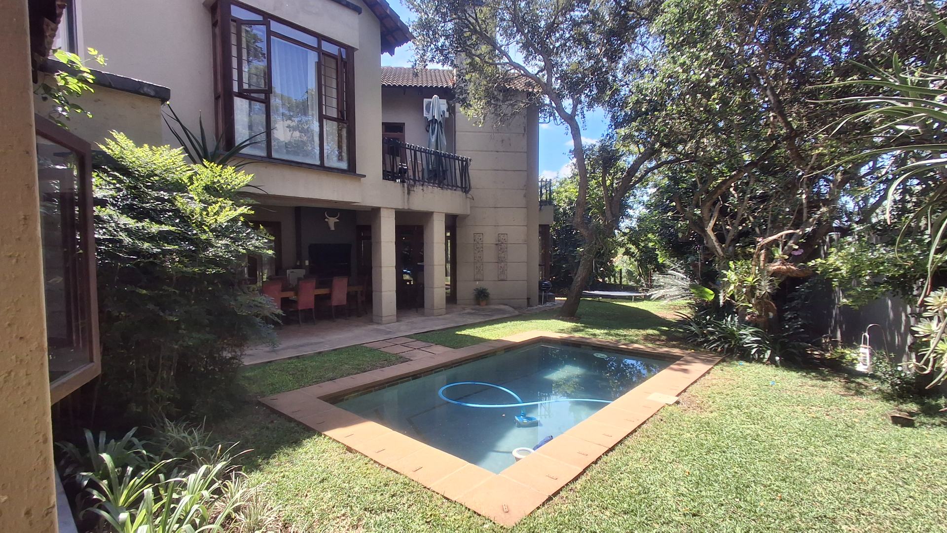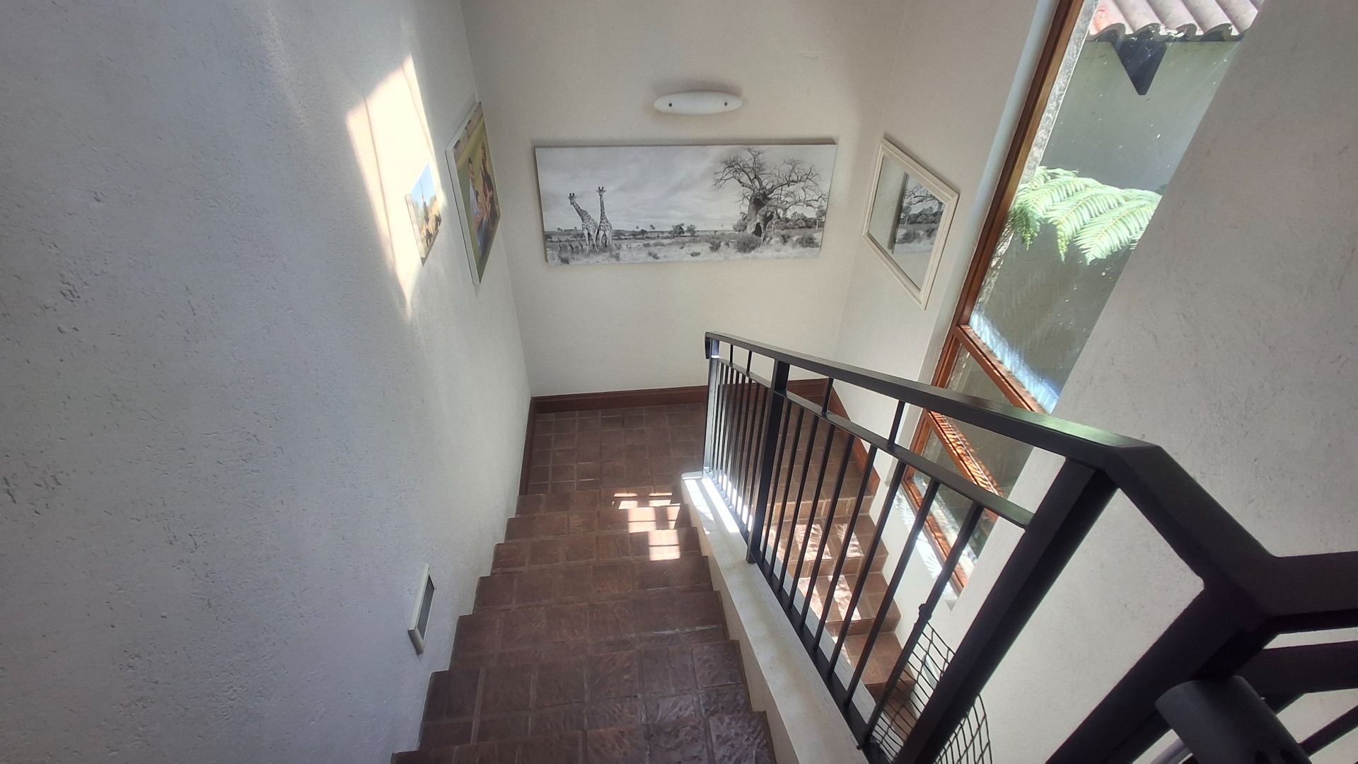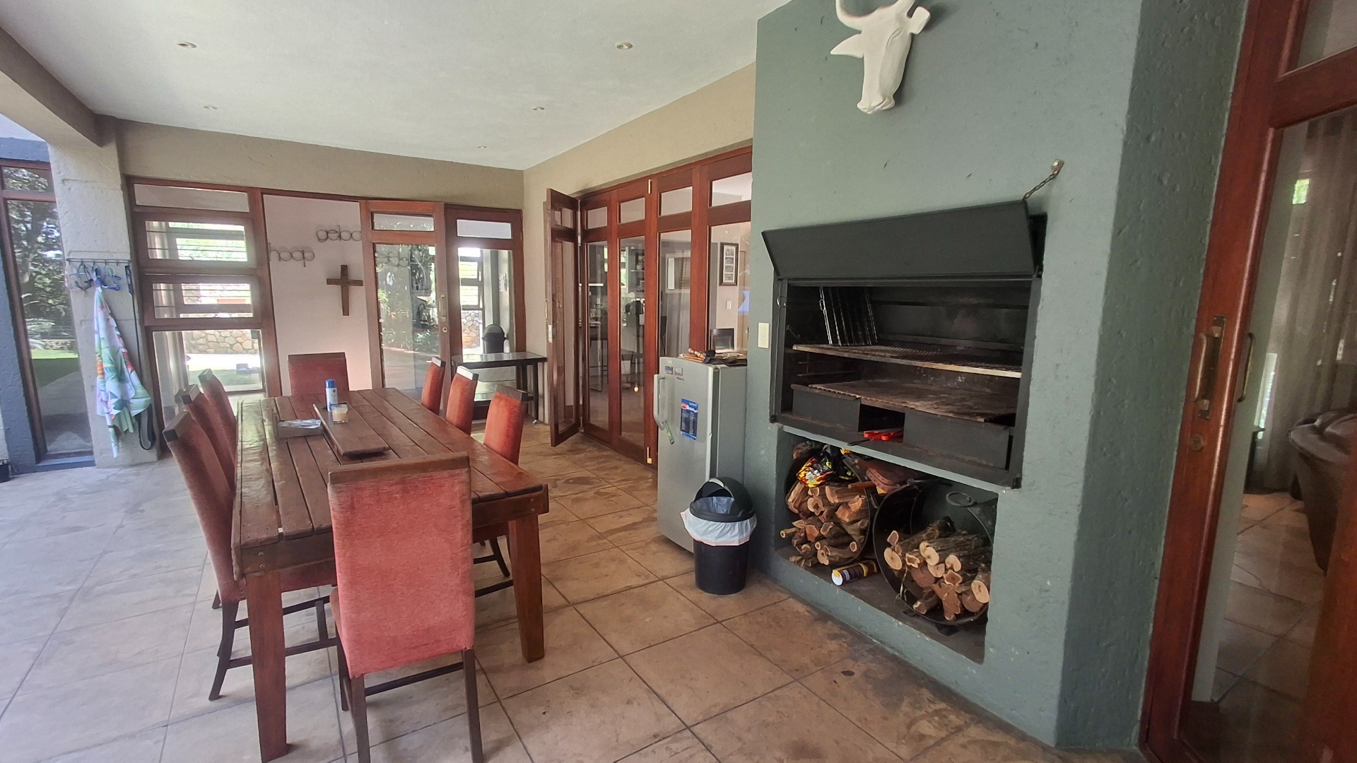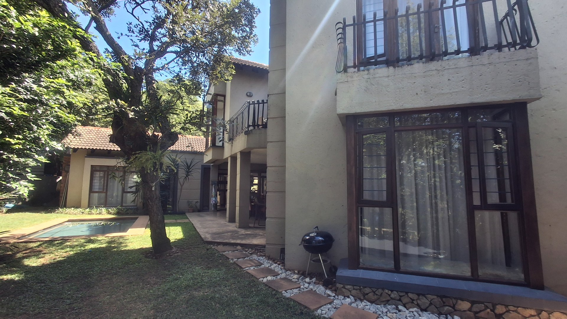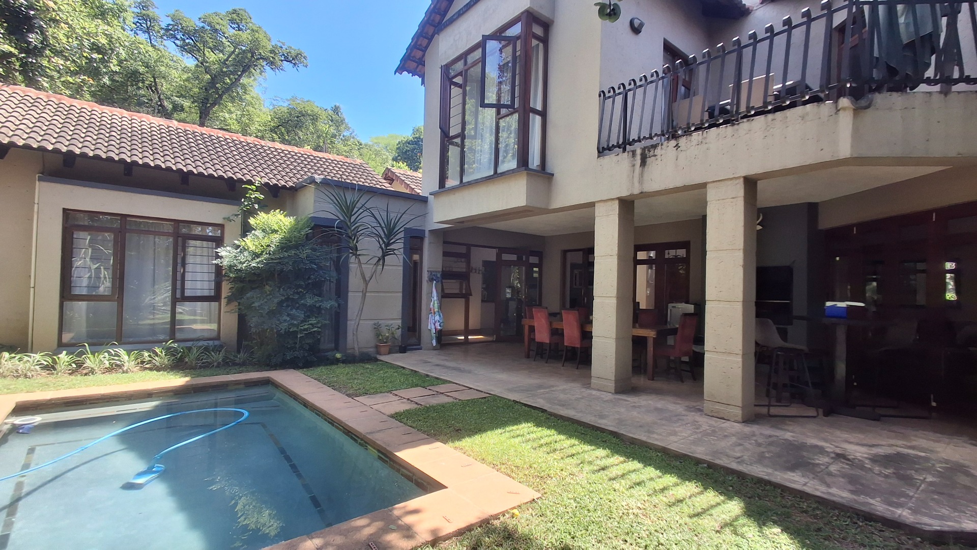 Outdoor living is a true pleasure with a private swimming pool set within a large, established garden, offering a tranquil retreat. Multiple balconies and a spacious covered patio, complete with a built-in braai, provide ideal settings for outdoor dining and entertaining. The property also includes two garages and three additional parking spaces, catering to all vehicle needs.