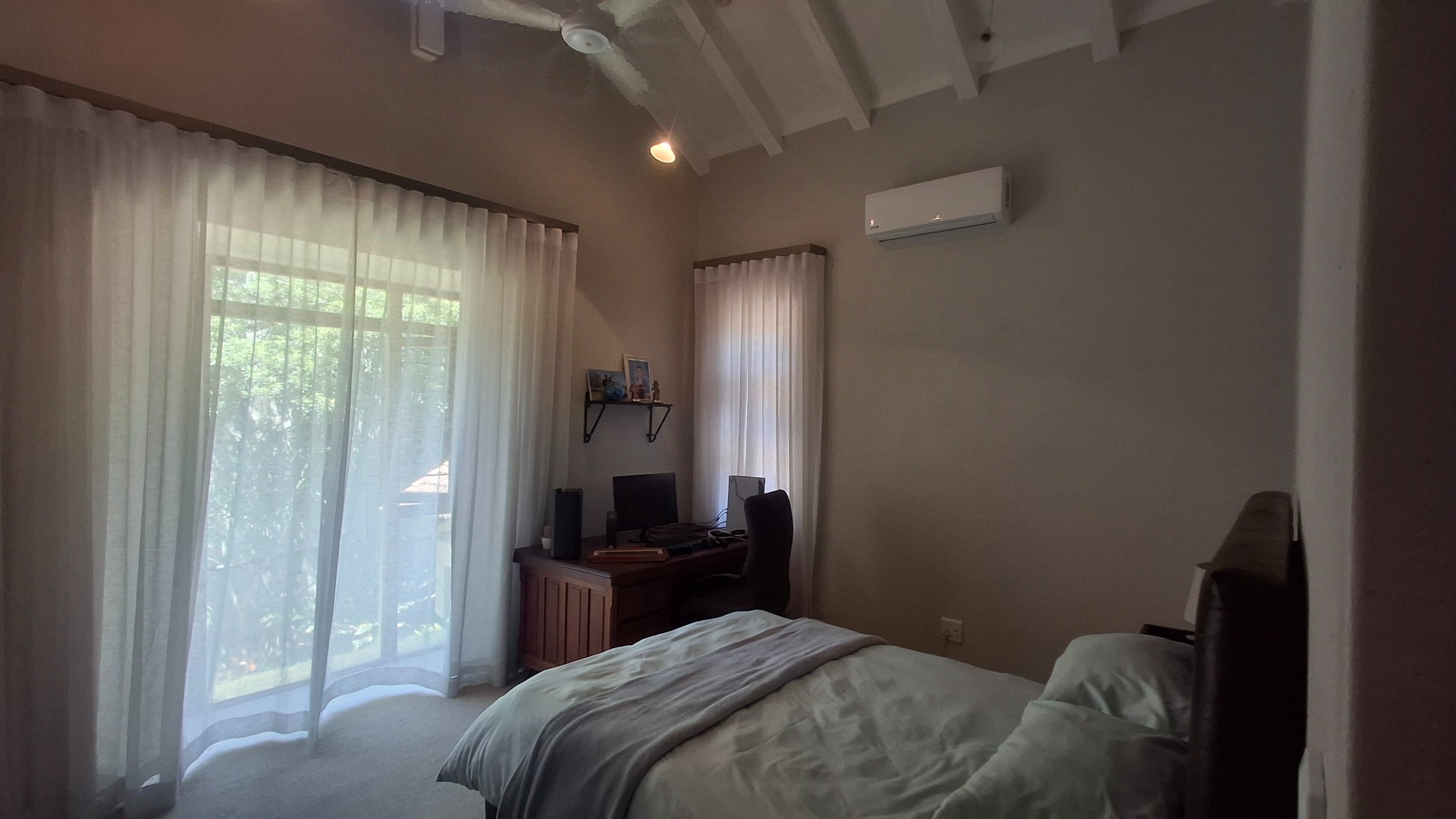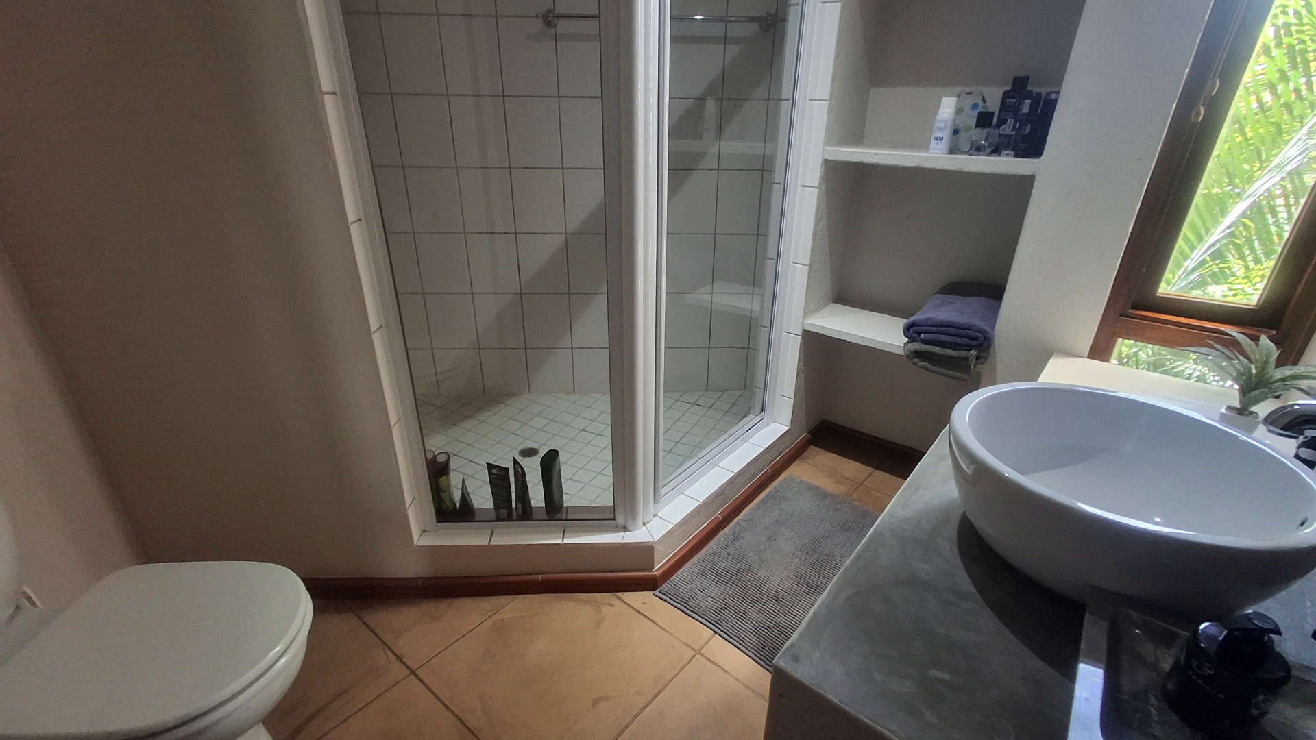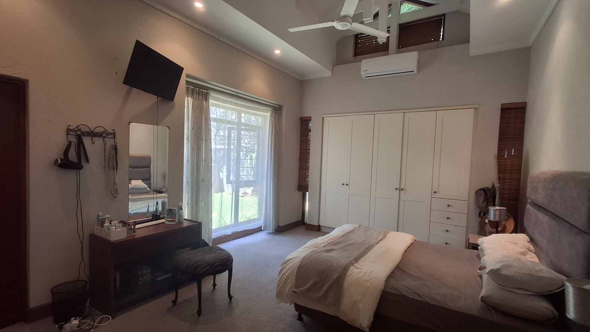 Nestled within the prestigious Matumi Golf Estate in Nelspruit, South Africa, this multi-level residence offers a blend of distinctive architecture and comfortable living. The property presents an inviting kerb appeal with its unique design featuring light-colored stucco walls, brick accents, and lush tropical landscaping, complemented by a paved driveway leading to the home.