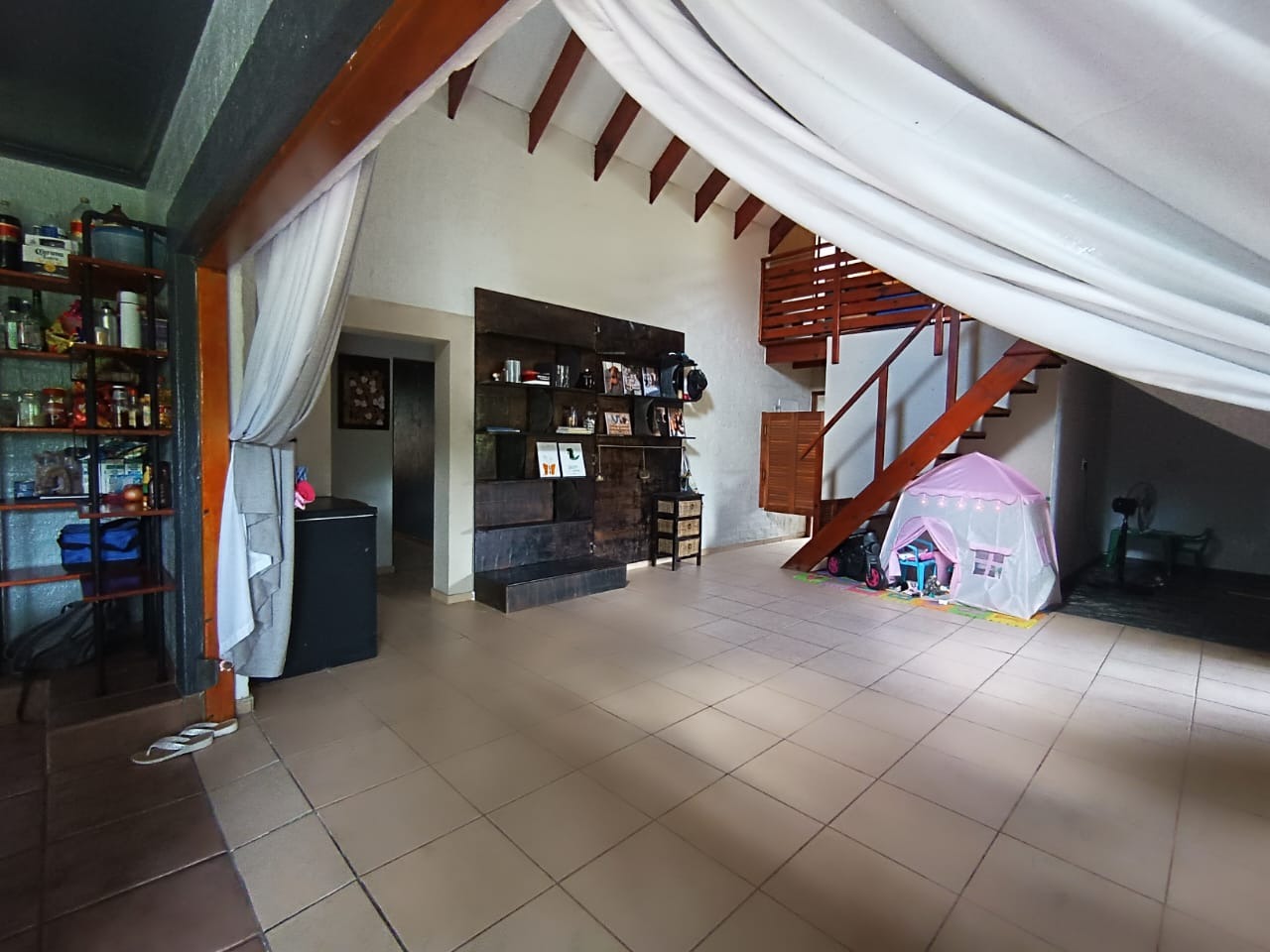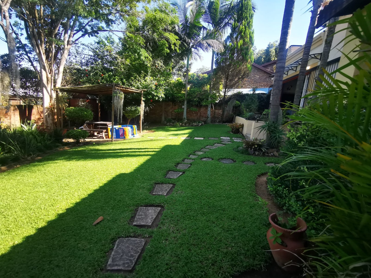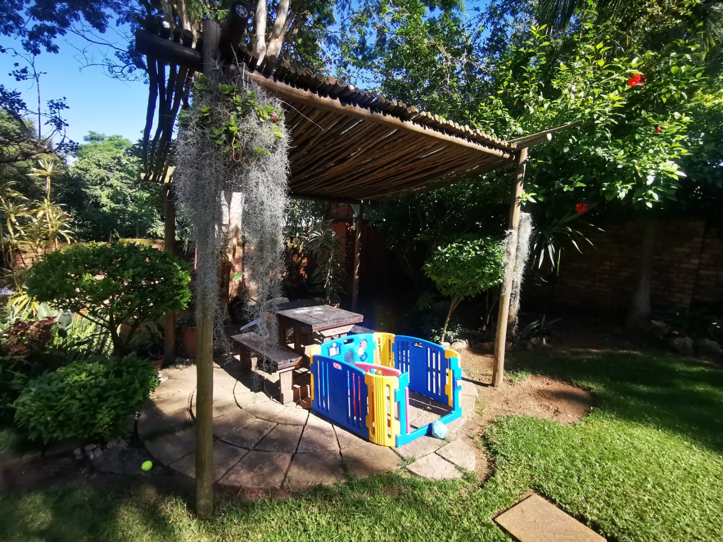 This distinguished three-bedroom residence, situated in the suburban enclave of Nelspruit Ext 27, offers a refined living experience. The property features a large open-plan layout that seamlessly integrates a lounge, dining room, and a well-appointed kitchen with a gas hob and mobile island. A dedicated study provides an ideal workspace. a braai room inside, which can have multiple uses, as the current owner explains. The interior boasts a unique multi-level design, including a mezzanine with a vaulted wooden ceiling offering verdant views. Outdoors, a meticulously maintained garden with a small pergola provides an exceptional setting for entertaining. Additional amenities include two bathrooms, one full en-suite bathroom, another full bathroom with the toilet separate, two garages, two additional parking spaces in front of the double garage, ample storage, and fibre connectivity. Security is enhanced with burglar bars and CCTV cameras that can be used as an intercom system as well. Pets are permitted.