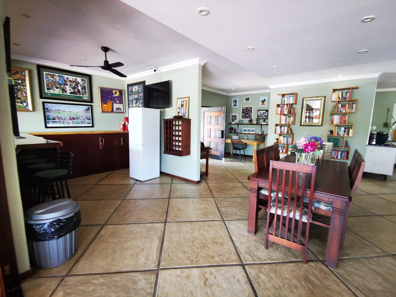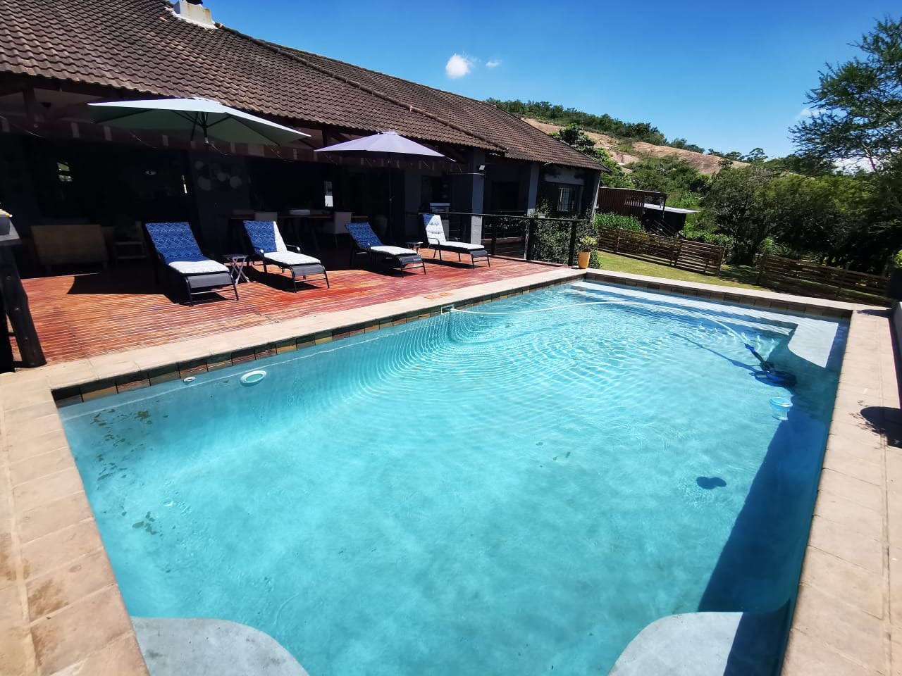 The outdoor amenities are designed for enjoyment and utility. A large garden, inviting patio, and a refreshing pool create an ideal setting for relaxation and entertaining. With ten parking spaces, a built-in braai, and a wendy house, the property caters to various lifestyle needs. Enjoy scenic views from this pet-friendly estate.