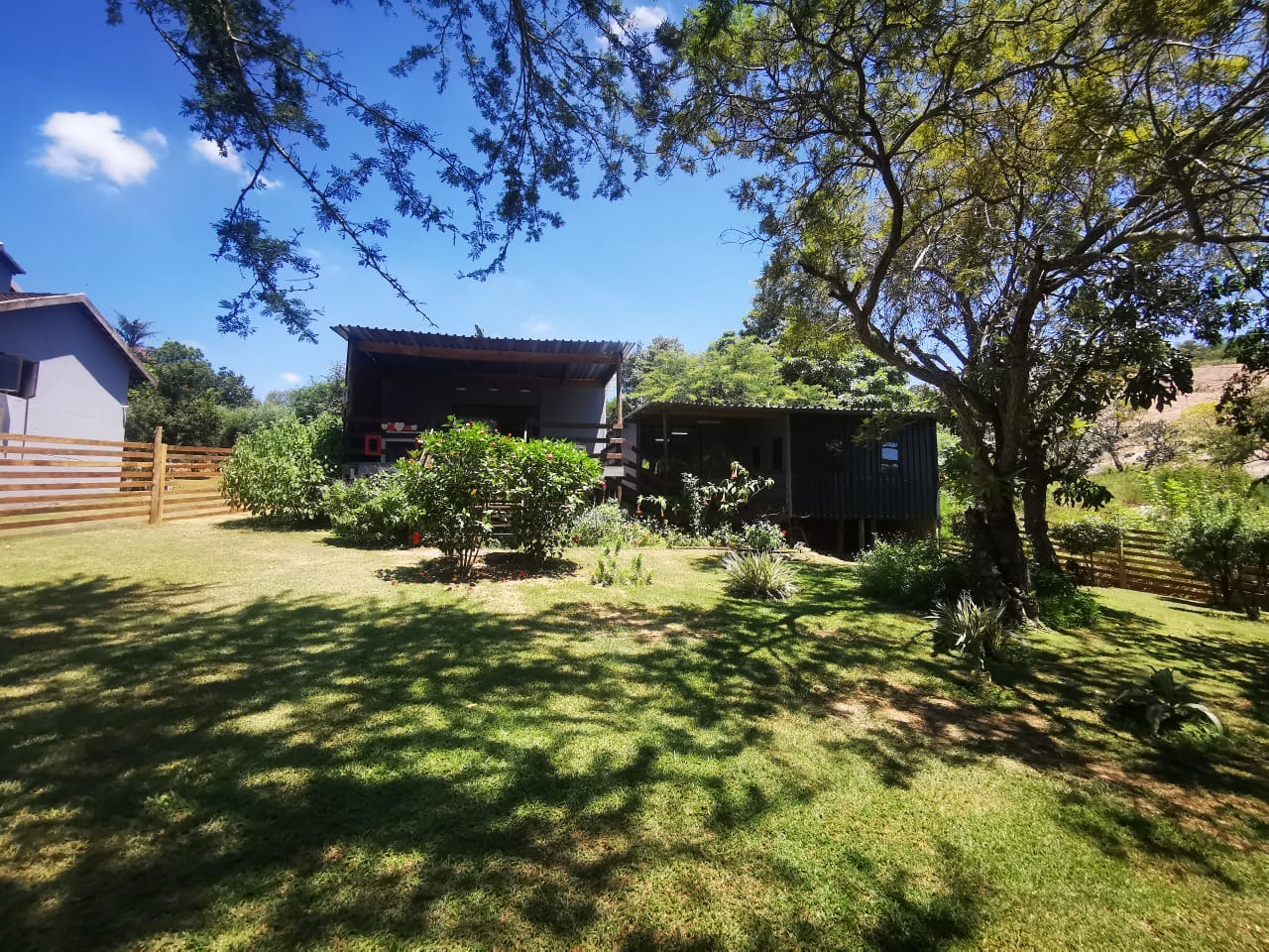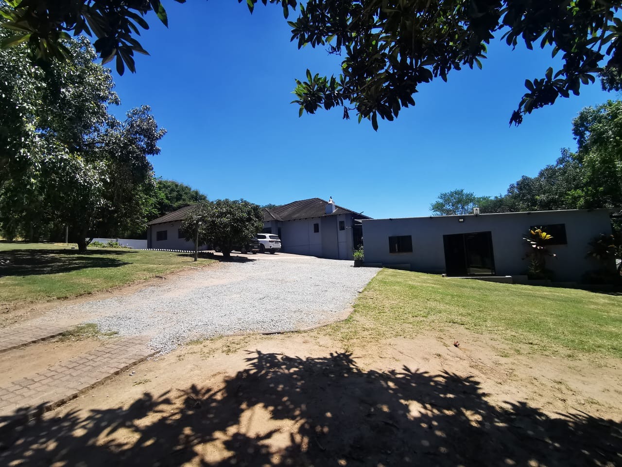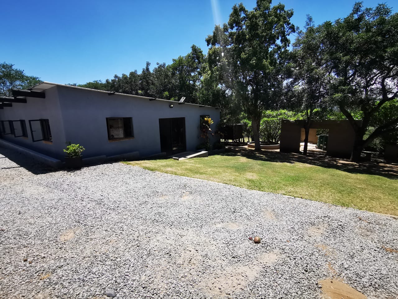 Discover an expansive lifestyle farm opportunity in Nelspruit Rural, offering a substantial 2.22-hectare erf. This property presents a unique blend of spacious living and versatile functionality, set amidst mature trees and a serene environment. The main residence, complemented by additional structures, features a welcoming grey/blue exterior with terracotta-colored roof tiles, exuding a classic charm.
