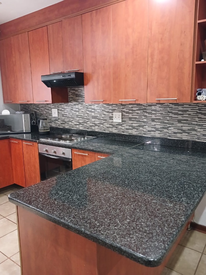 The well-appointed kitchen is a highlight, equipped with dark granite countertops, a stylish mosaic tile backsplash, and ample wooden cabinetry. It includes an integrated oven, hob, and extractor fan, alongside a convenient kitchen island that doubles as a breakfast bar, perfect for casual meals or entertaining.