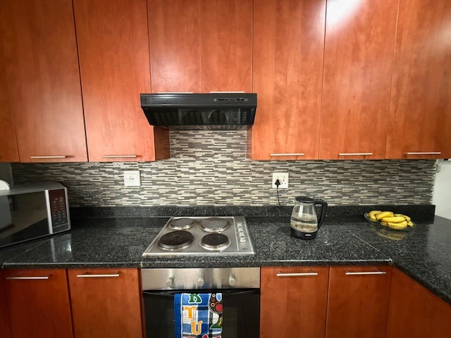 The well-appointed kitchen is a highlight, equipped with dark granite countertops, a stylish mosaic tile backsplash, and ample wooden cabinetry. It includes an integrated oven, hob, and extractor fan, alongside a convenient kitchen island that doubles as a breakfast bar, perfect for casual meals or entertaining.
