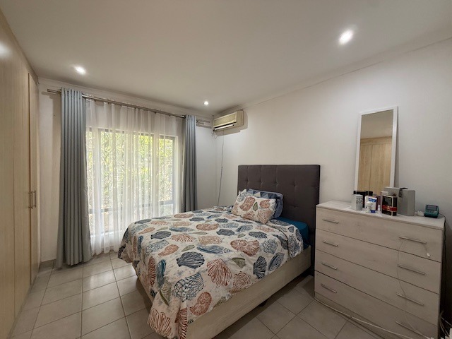 This residence offers three comfortable bedrooms, each featuring extensive built-in wardrobes for optimal storage. There are two bathrooms, with one being an ensuite, plus an additional guest toilet for convenience. The bathrooms are functional, featuring modern glass shower enclosures and practical tiled surfaces.