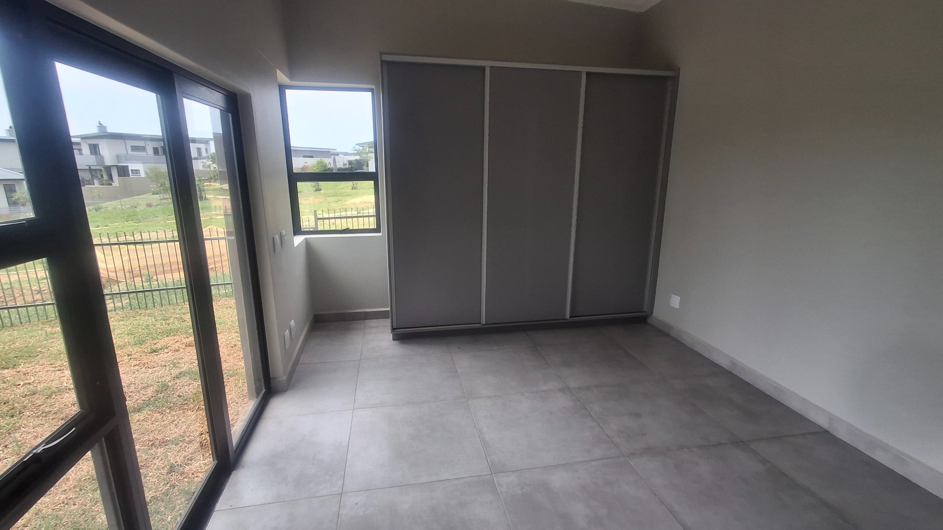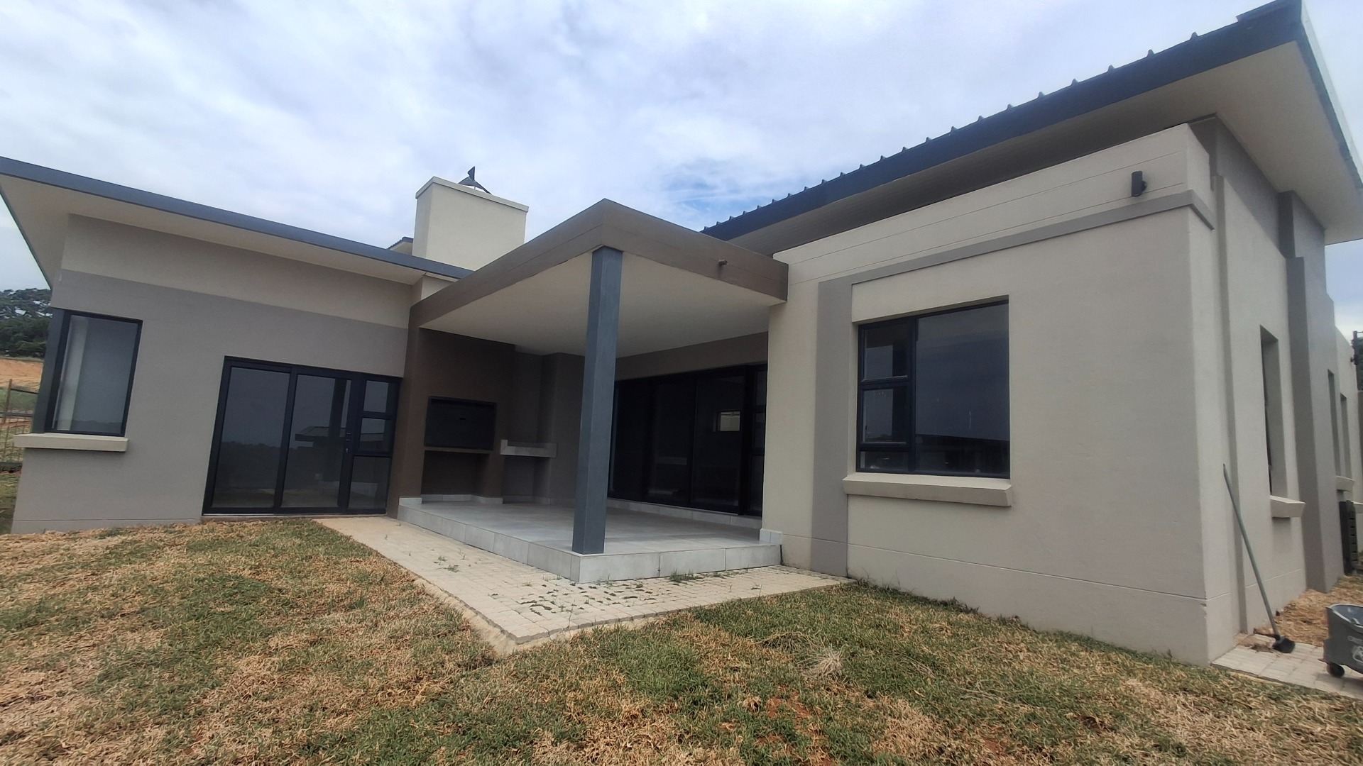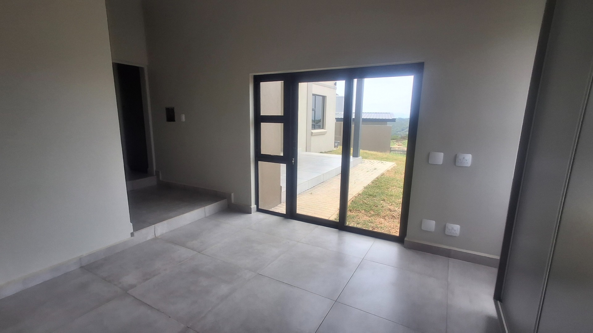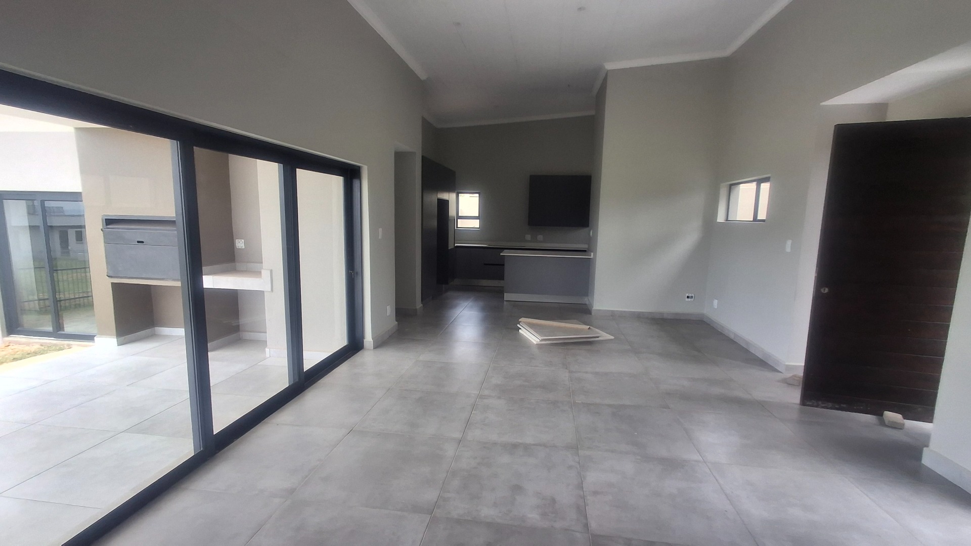 The interior features an inviting open-plan layout, perfect for modern family life and entertaining. The living areas are finished with contemporary grey tiles and neutral walls, complemented by high ceilings that enhance the sense of space. Large sliding glass doors seamlessly connect the indoor living space to an outdoor patio, which includes a built-in braai, ideal for enjoying the scenic views and the South African climate.