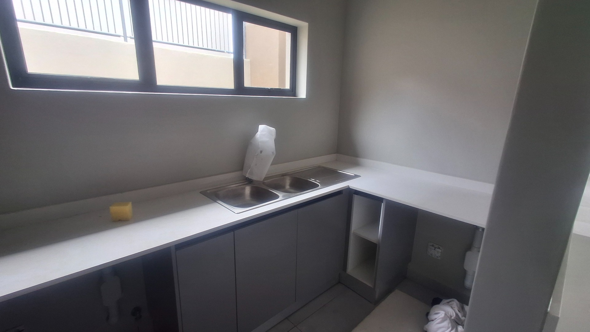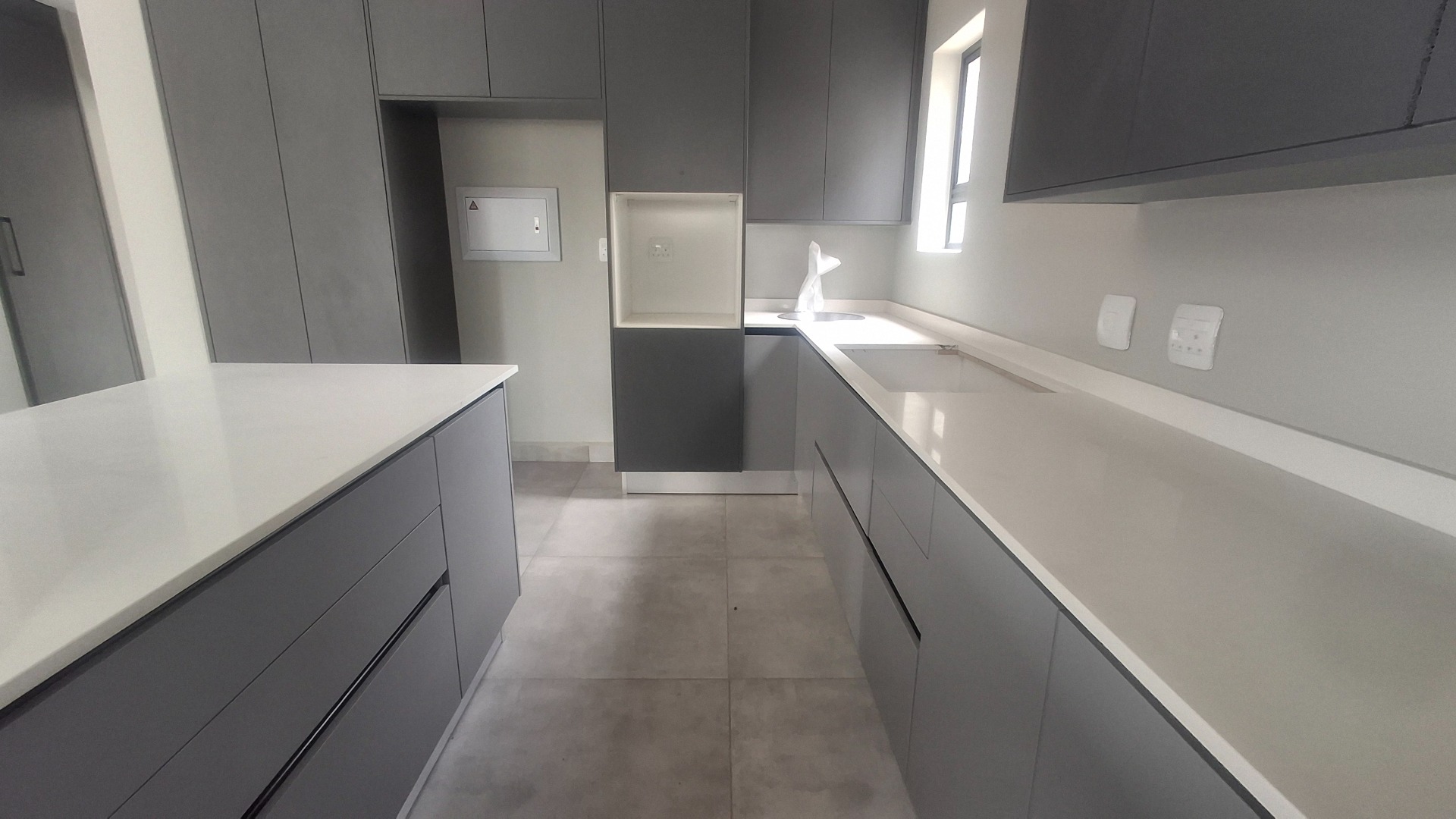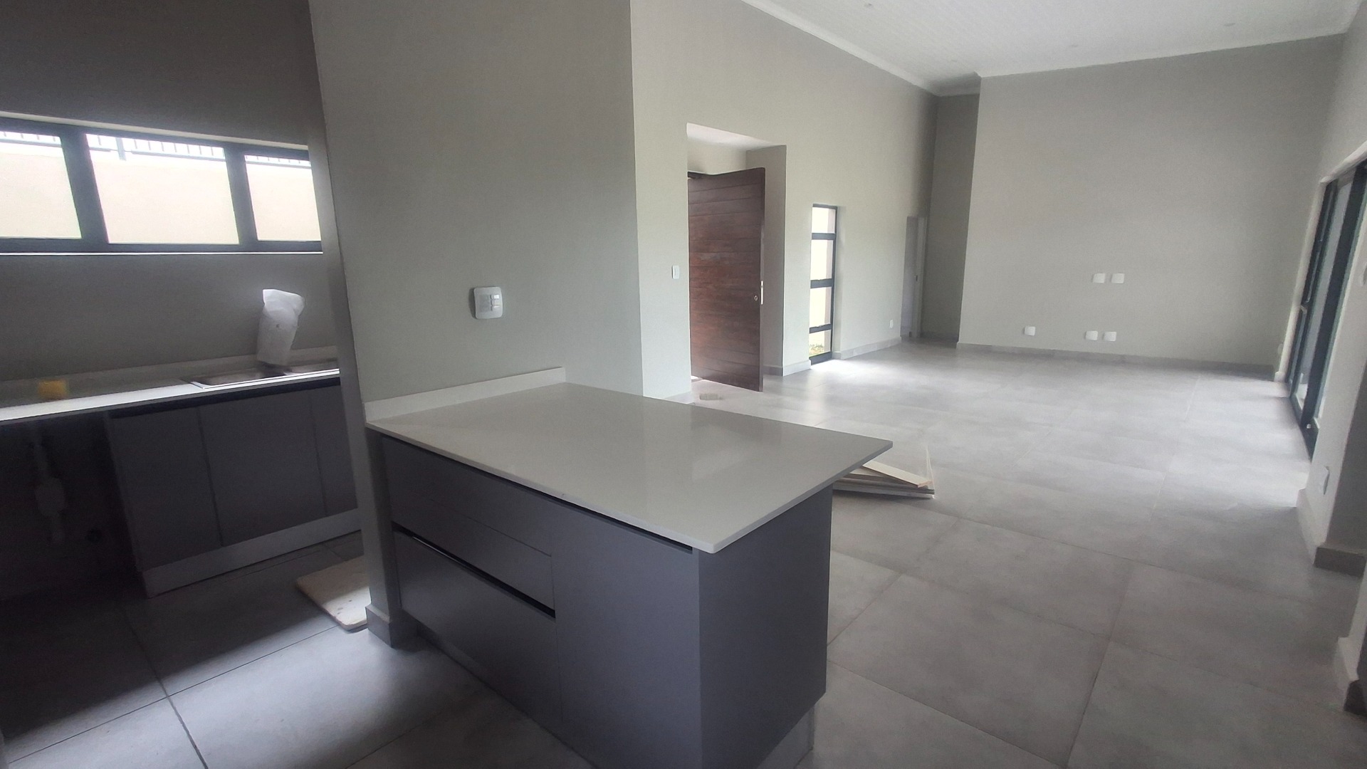 The sleek kitchen is a highlight, equipped with dark grey, handleless cabinetry and generous light-coloured countertops, including an island/peninsula. While appliances are not included, this provides a blank canvas for customisation. The three well-proportioned bedrooms offer comfortable accommodation, with the main bedroom featuring an en-suite bathroom. Modern built-in wardrobes are present, and large windows ensure abundant natural light throughout.
