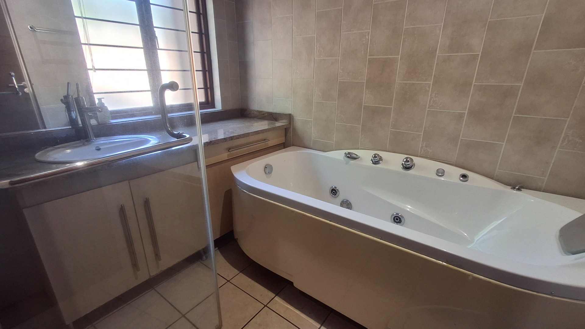Indulge in the luxurious master suite, featuring a private en-suite bathroom with a lavish jetted corner bathtub, alongside two additional well-appointed bathrooms serving the remaining three spacious bedrooms. The interior flow extends effortlessly to the outdoors, where a generous covered patio awaits, complete with a built-in braai ideal for dining and entertaining.