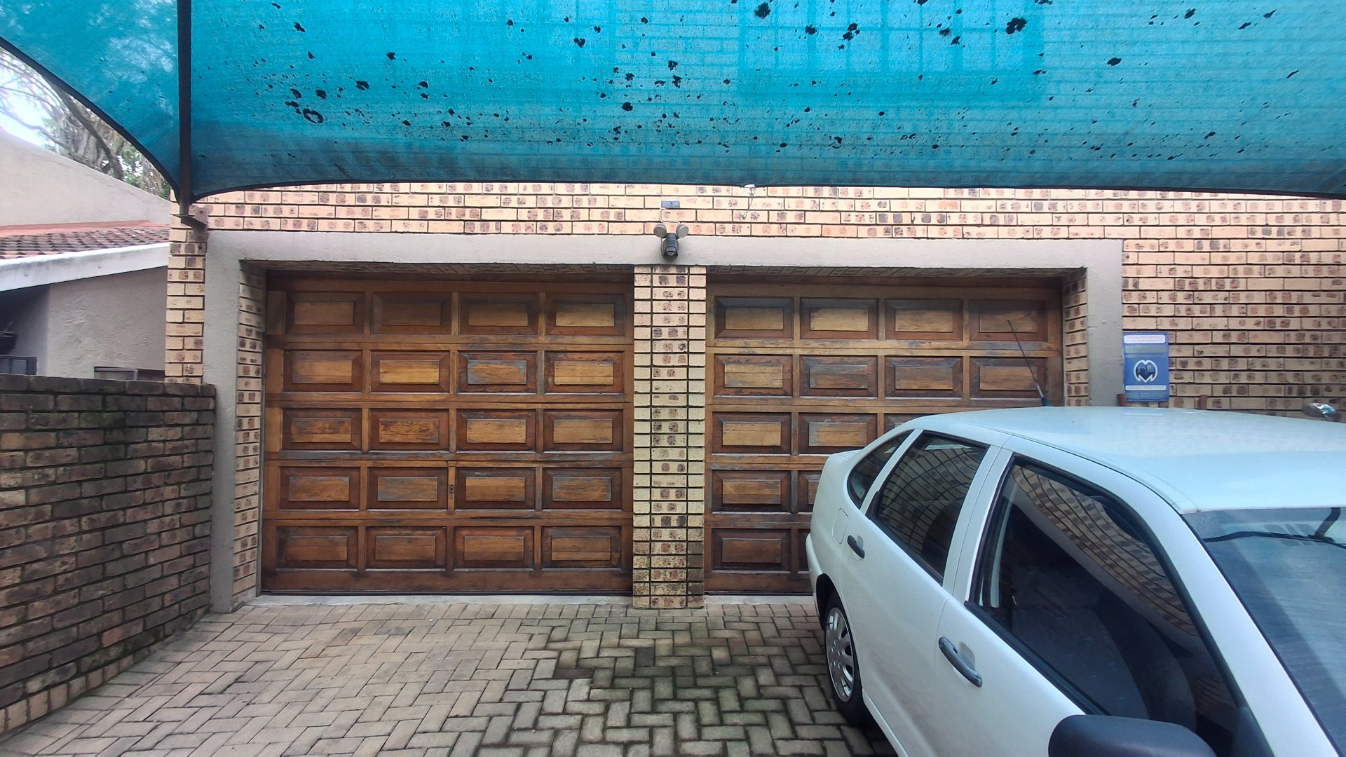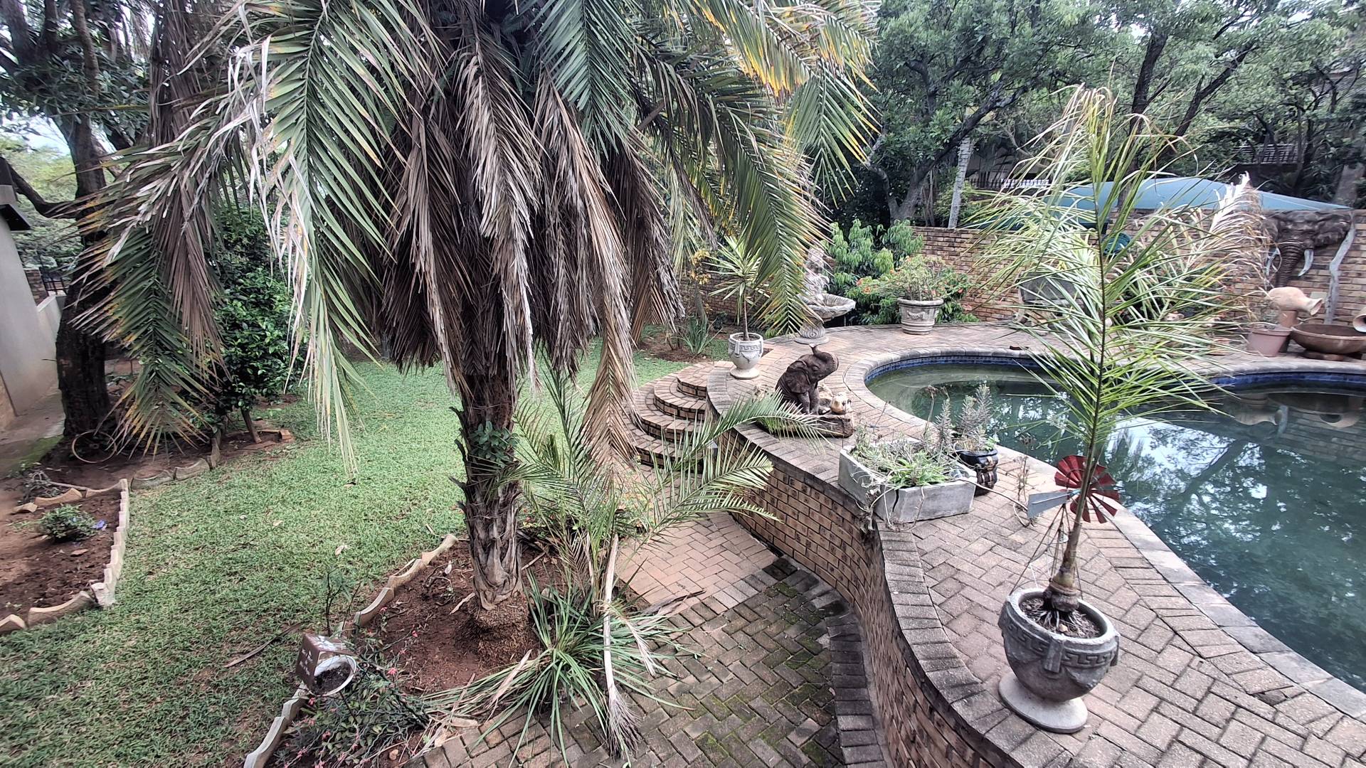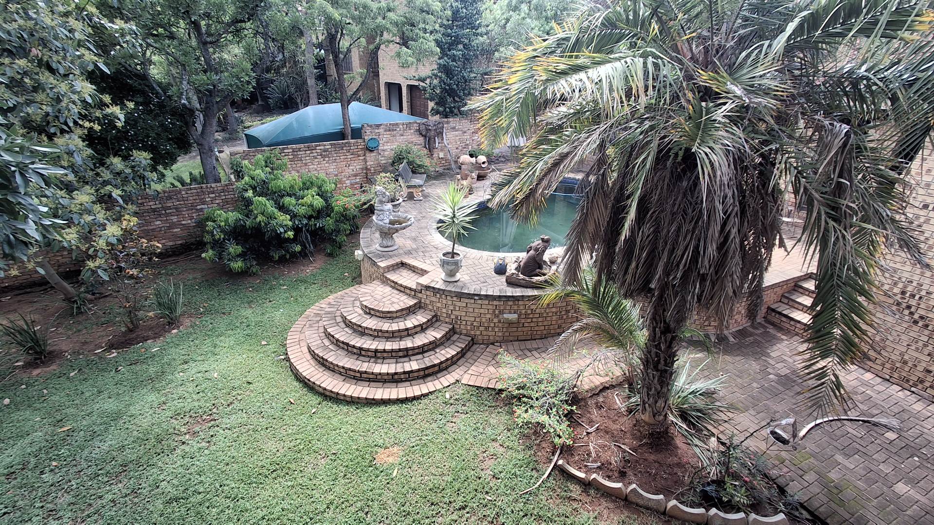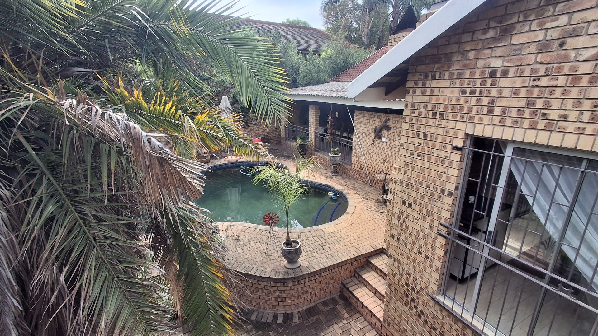 Step outside to a private oasis featuring a kidney-shaped swimming pool with paved surrounds and a covered outdoor patio with a home fire braai, perfect for relaxation and social gatherings. The property is enveloped by mature trees and lush landscaping, enhancing privacy and curb appeal. Security is a priority, with a brick boundary wall, a gated entrance, security bars on windows, and beams in front of the windows.