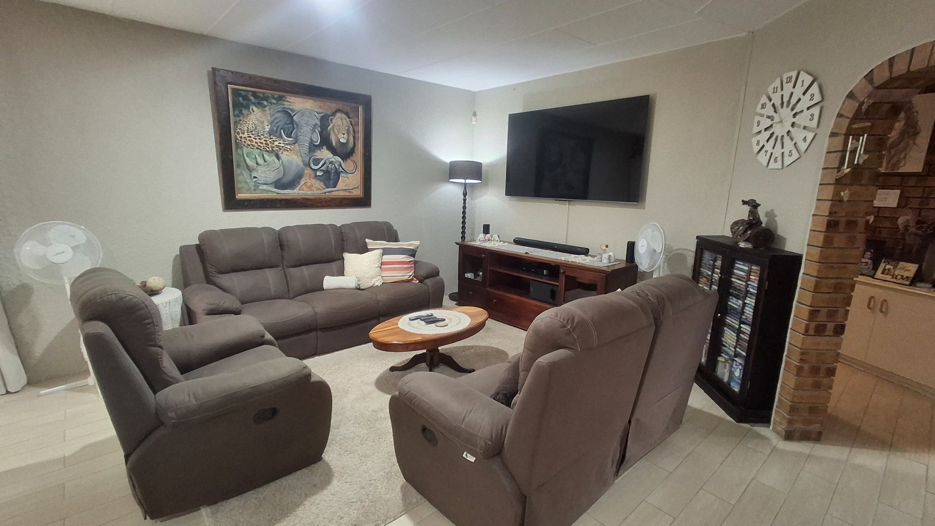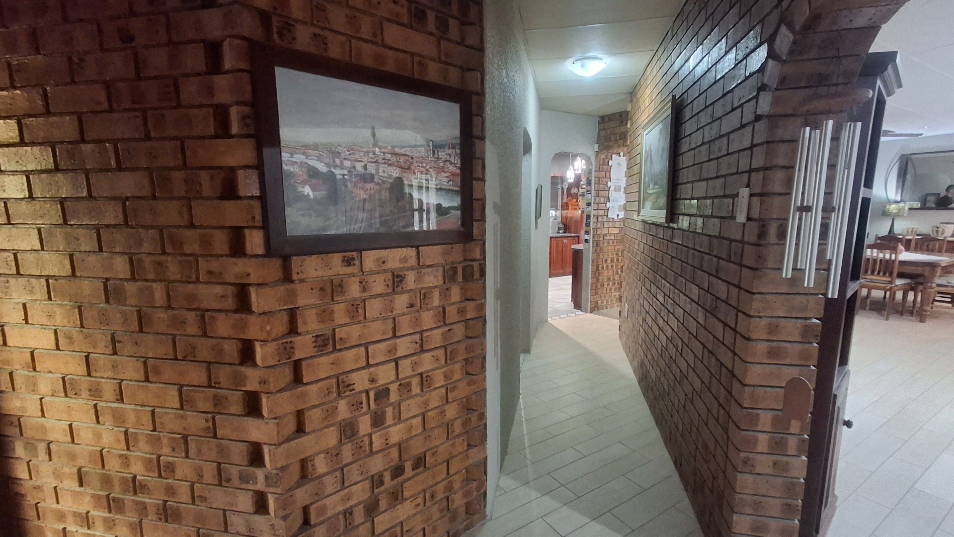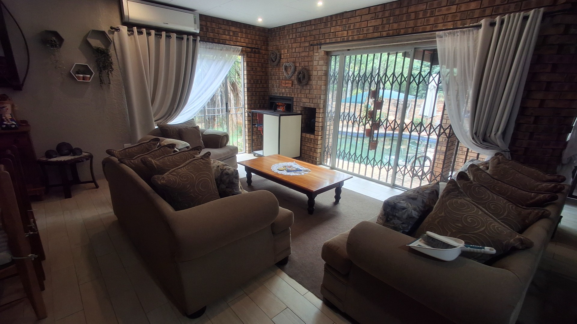 Back to the main house, the interior features a versatile layout with two distinct lounges and two dining areas, providing flexibility for various family activities. The open-plan living space seamlessly integrates a kitchen bar, dining, and living room, all adorned with practical tiled flooring, brick accent walls, and modern recessed lighting. Climate control is ensured with both air conditioning and ceiling fans in key areas. A dedicated living area offers an indoor braai/fireplace and direct access to the outdoor pool area via large glass sliding doors, secured by robust security gates. The face brick exterior provides for low maintenance requirements.