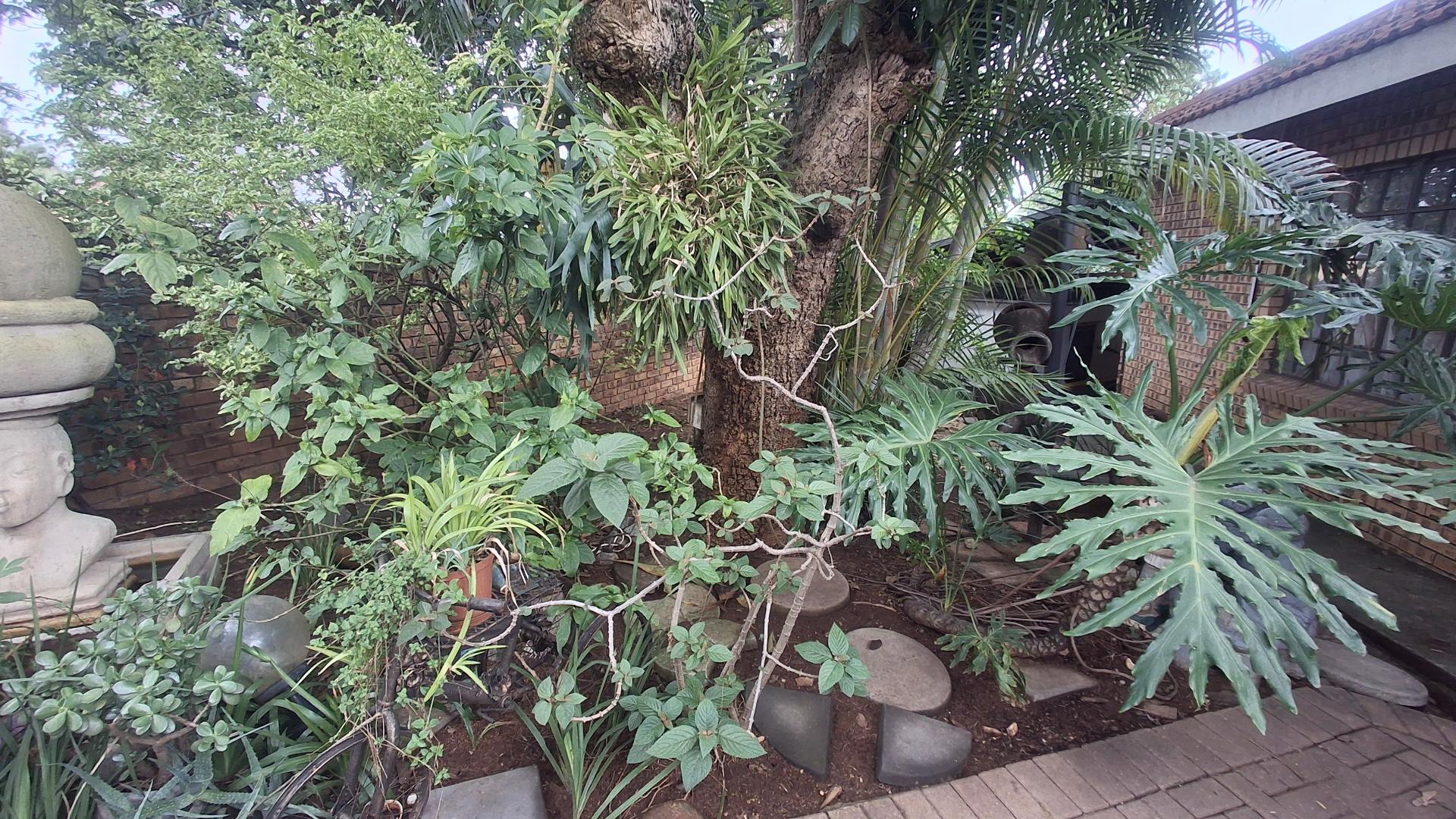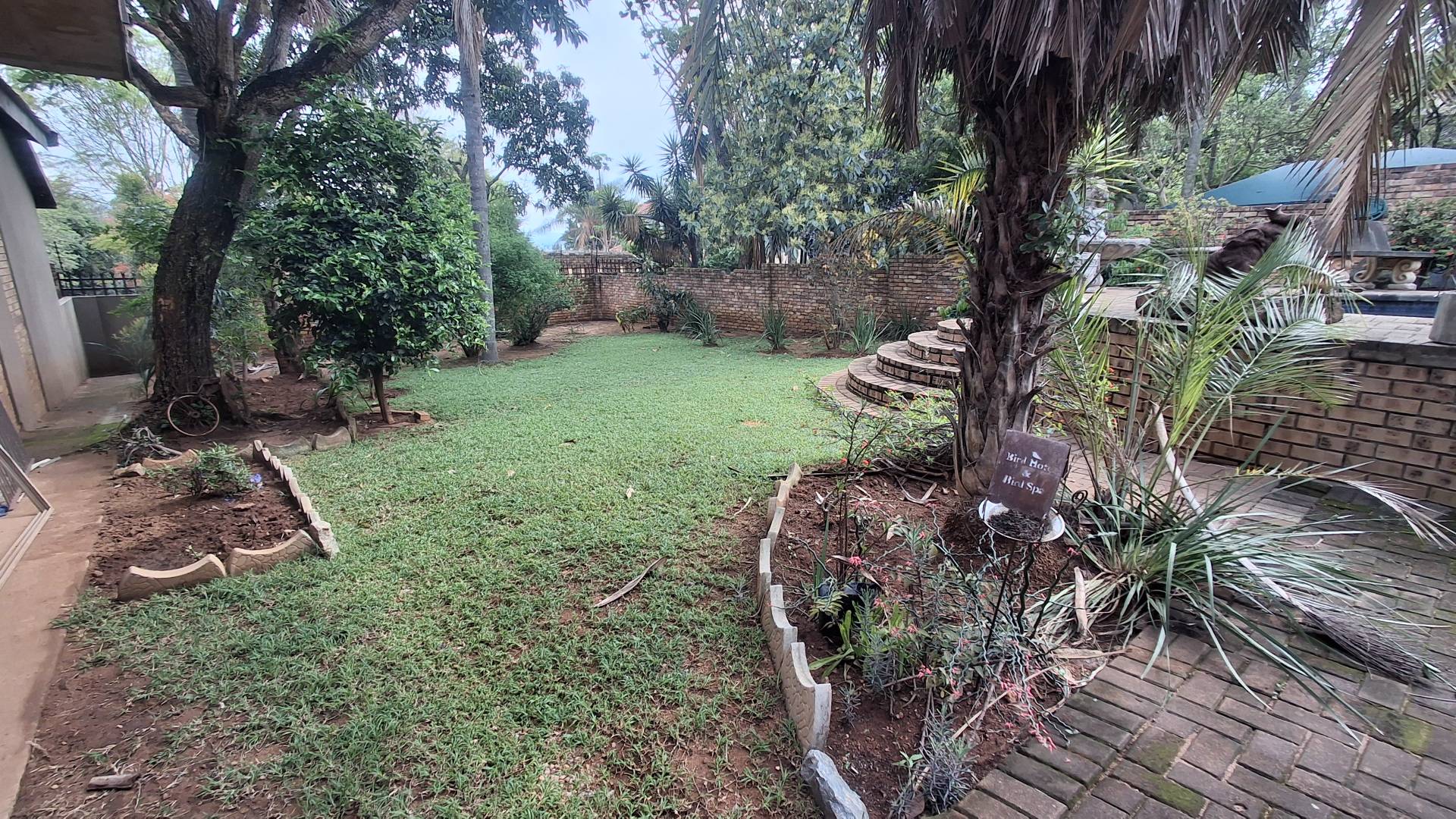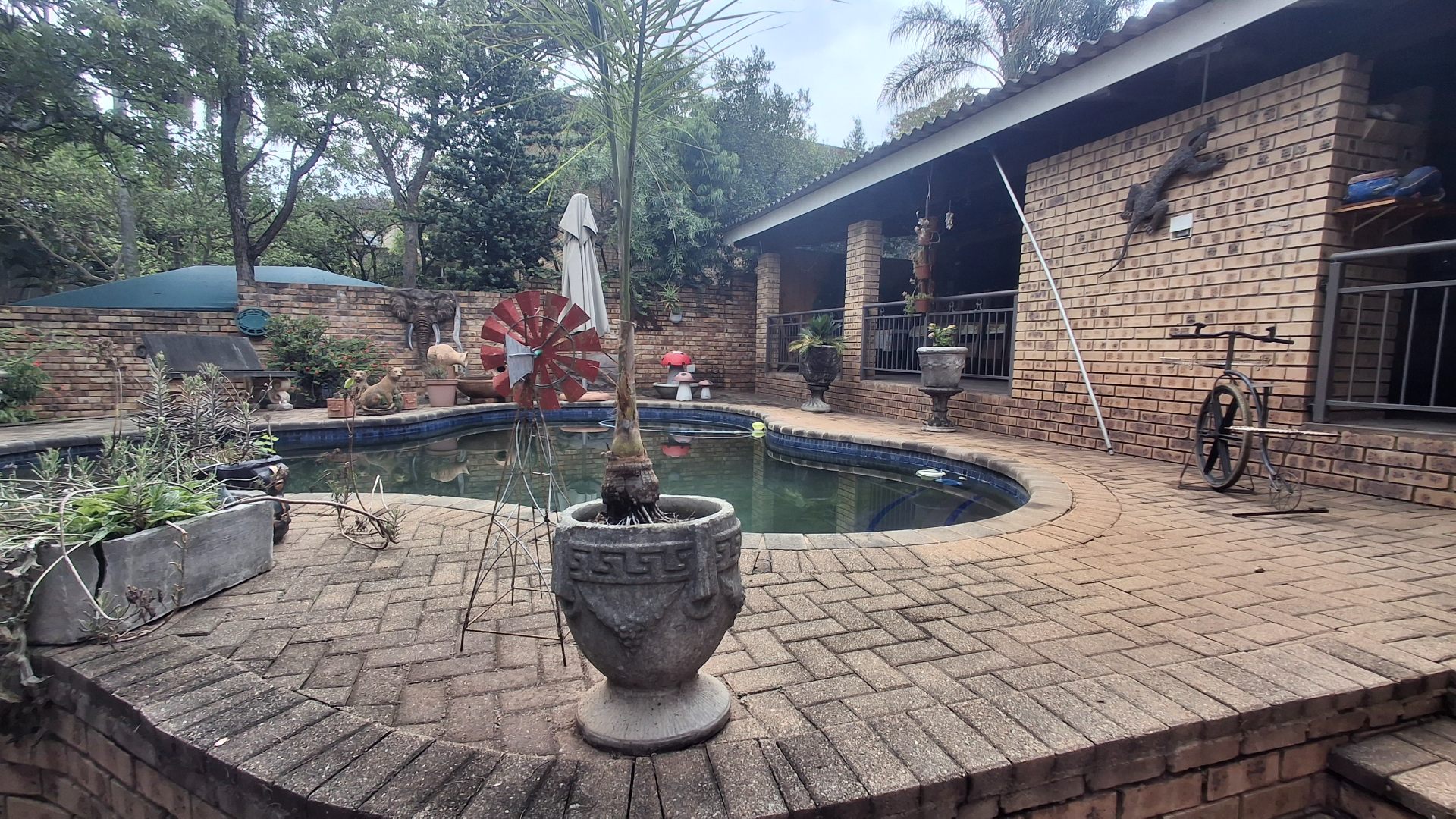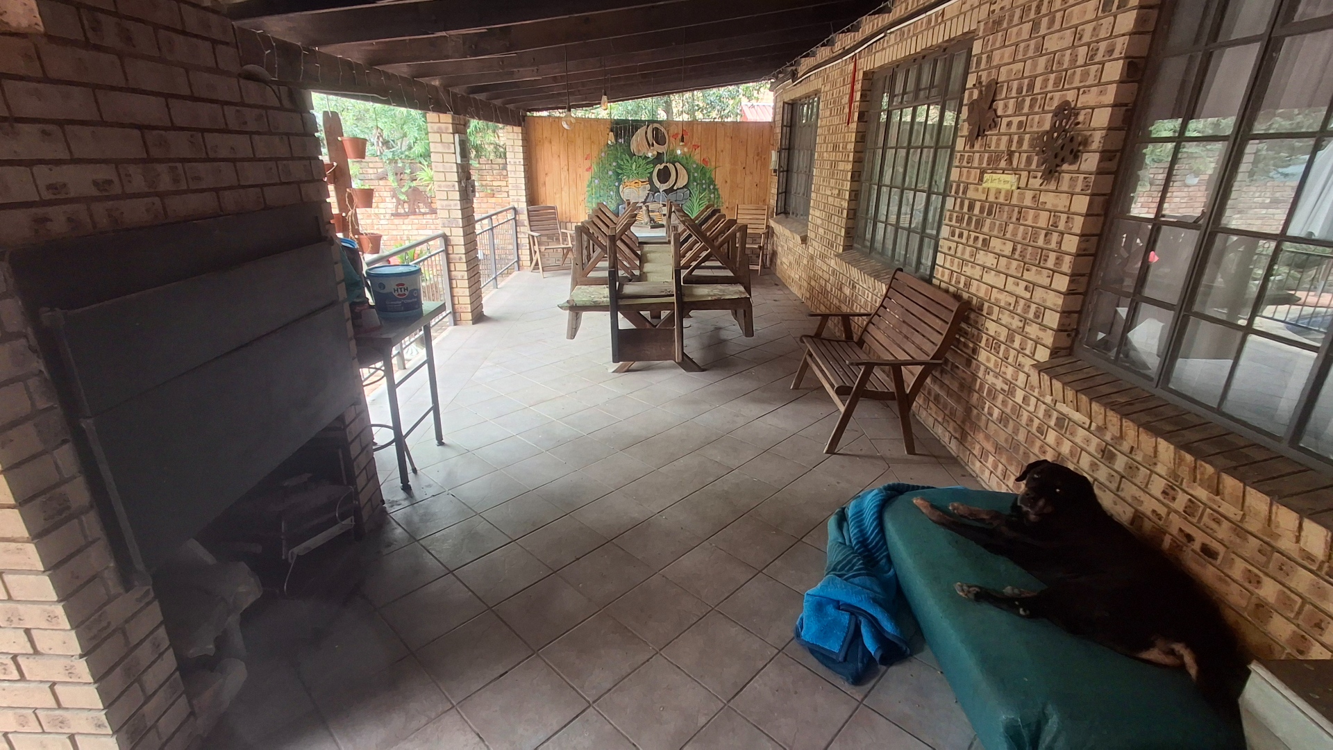 Step outside to a private oasis featuring a kidney-shaped swimming pool with paved surrounds and a covered outdoor patio with a home fire braai, perfect for relaxation and social gatherings. The property is enveloped by mature trees and lush landscaping, enhancing privacy and curb appeal. Security is a priority, with a brick boundary wall, a gated entrance, security bars on windows, and beams in front of the windows.