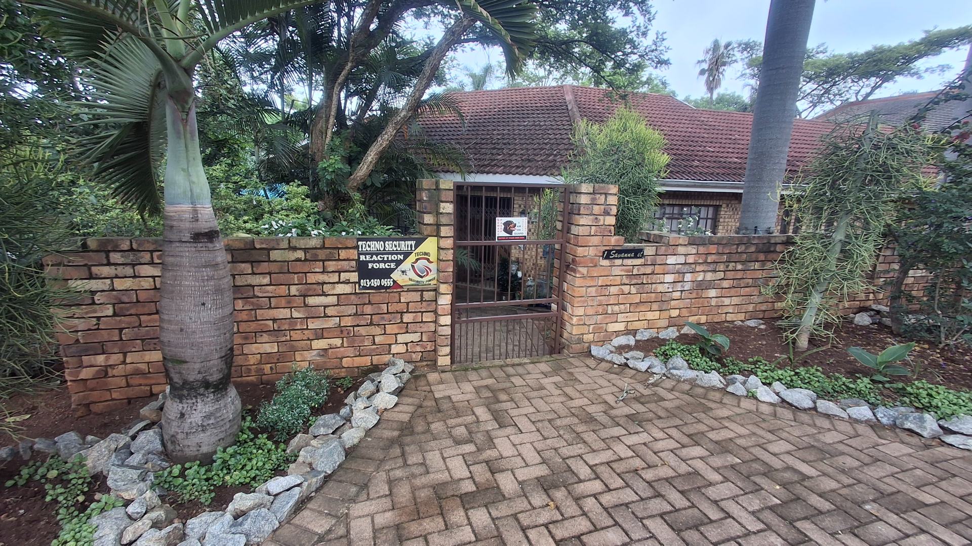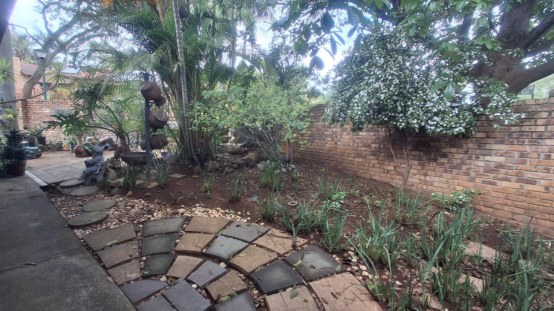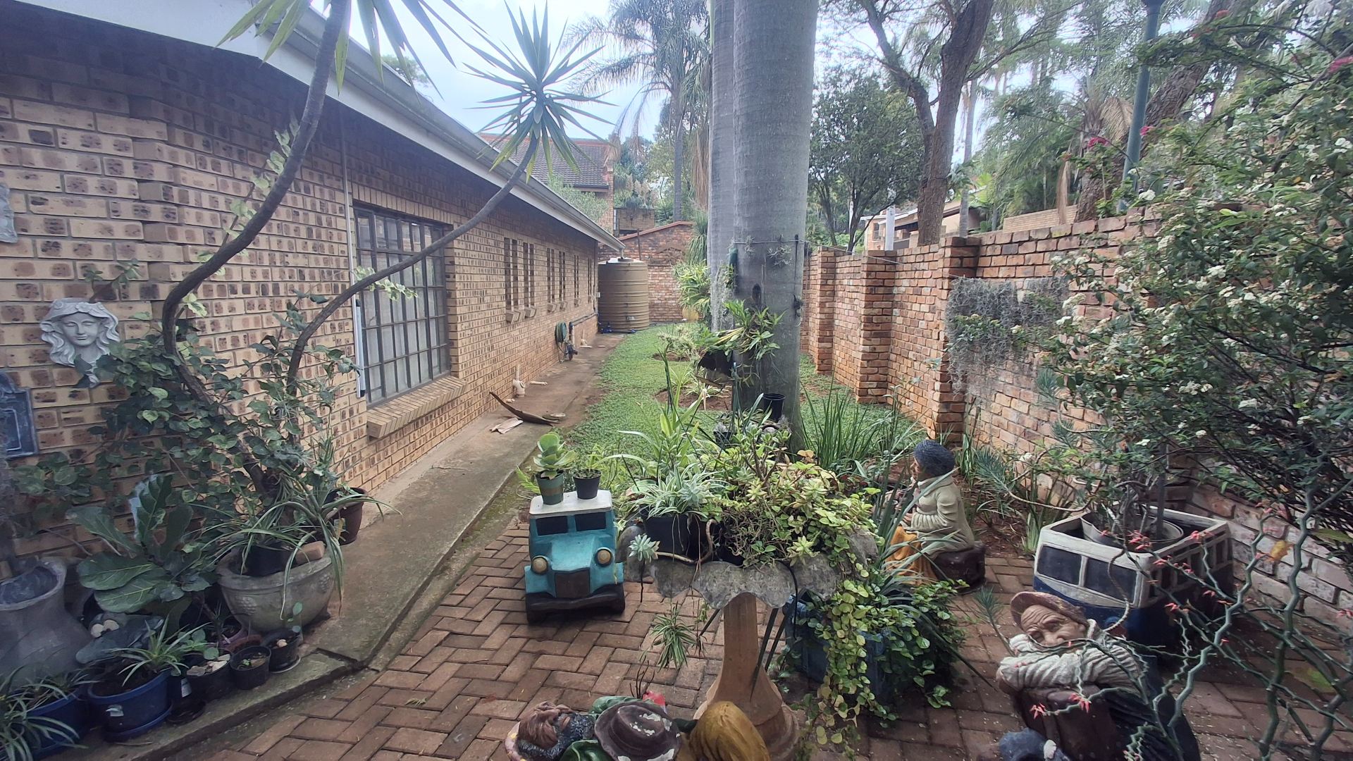 Step outside to a private oasis featuring a kidney-shaped swimming pool with paved surrounds and a covered outdoor patio with a home fire braai, perfect for relaxation and social gatherings. The property is enveloped by mature trees and lush landscaping, enhancing privacy and curb appeal. Security is a priority, with a brick boundary wall, a gated entrance, security bars on windows, and beams in front of the windows.