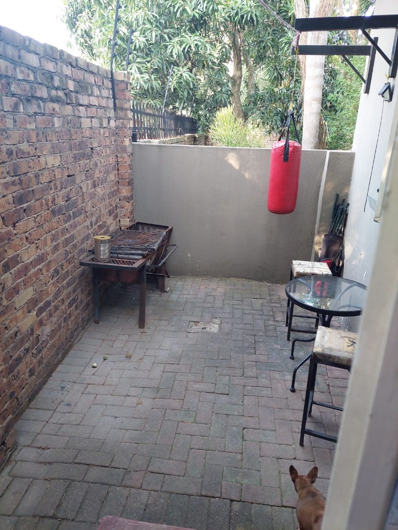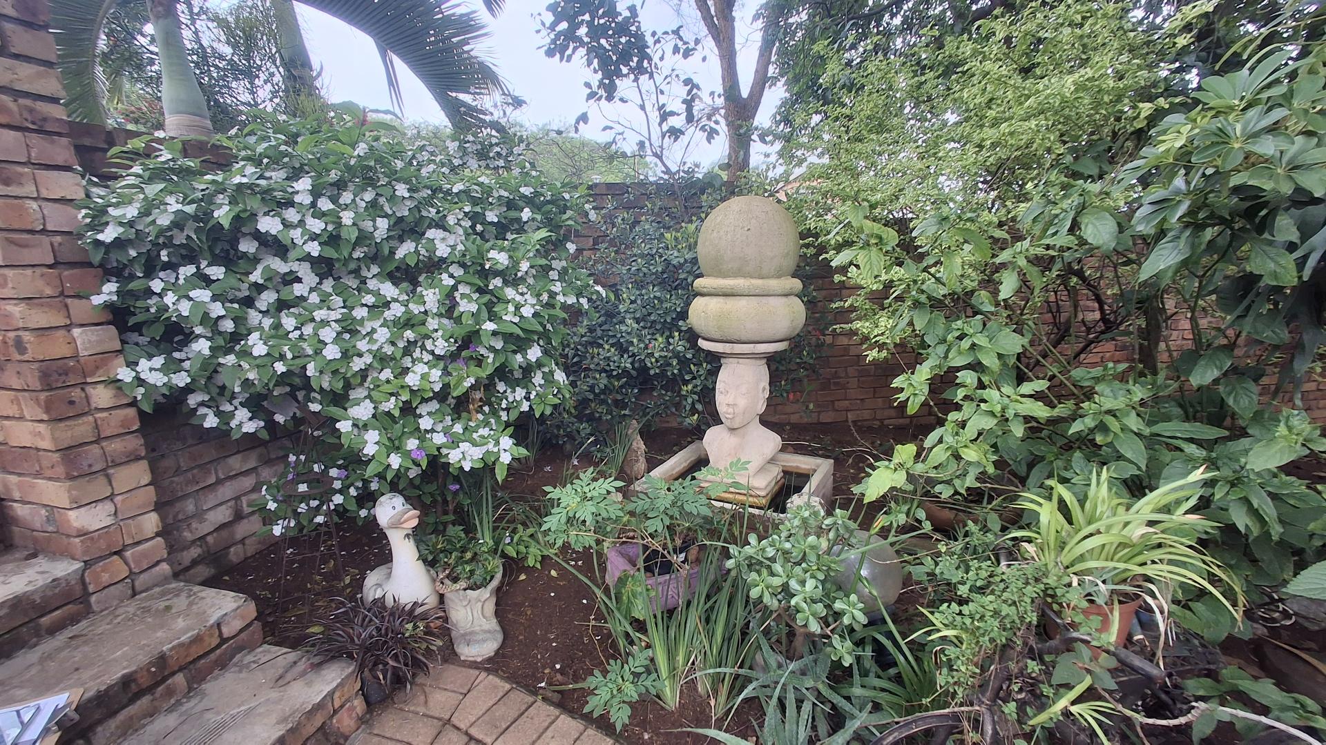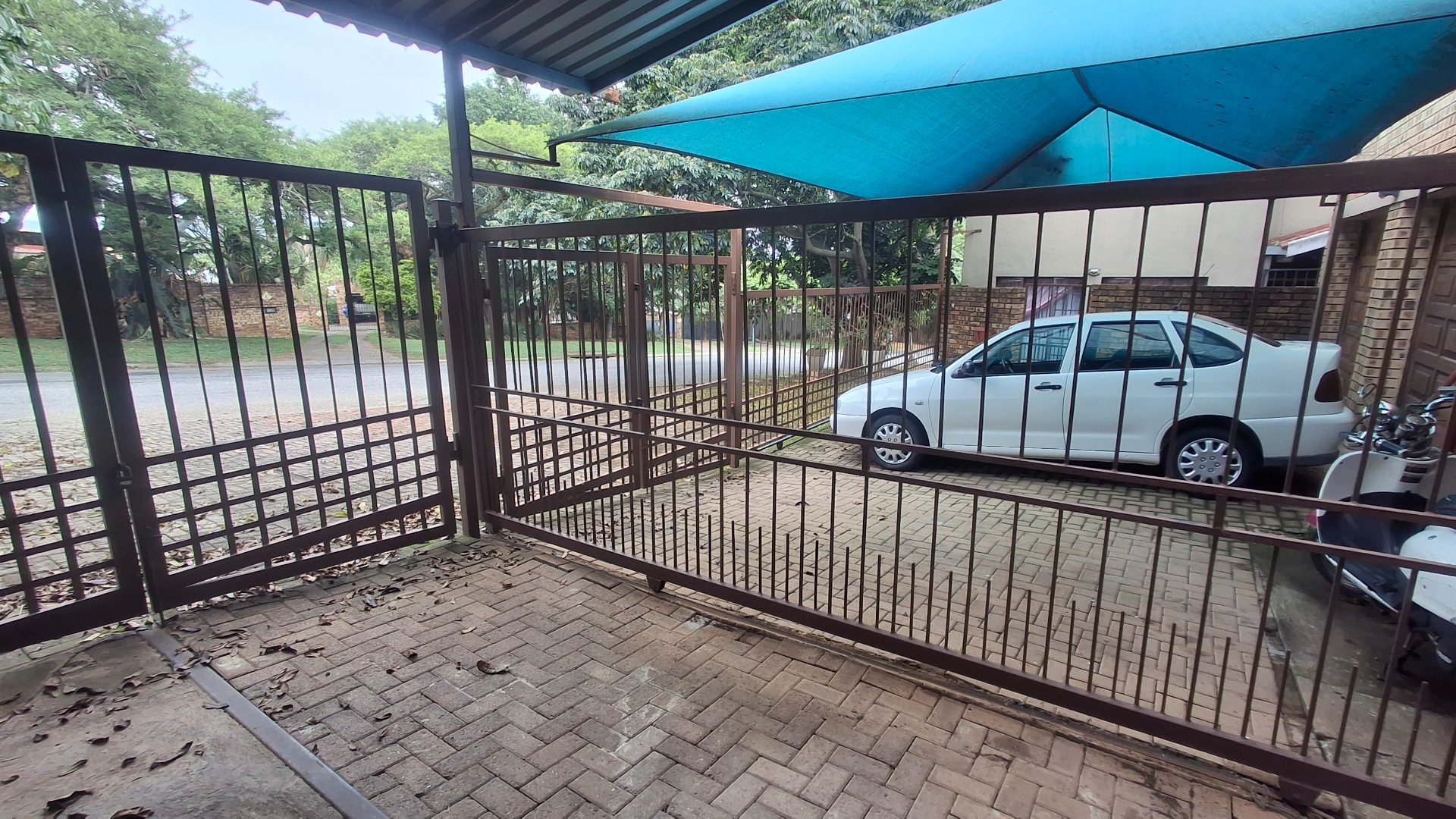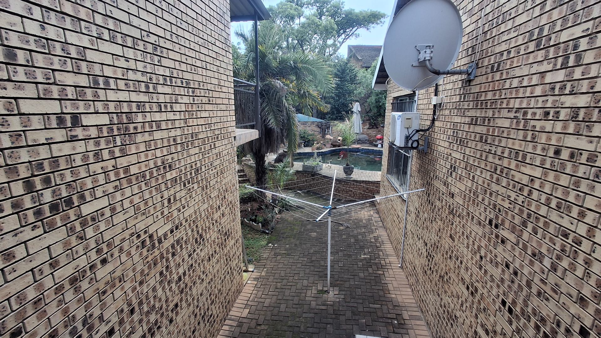 Step outside to a private oasis featuring a kidney-shaped swimming pool with paved surrounds and a covered outdoor patio with a home fire braai, perfect for relaxation and social gatherings. The property is enveloped by mature trees and lush landscaping, enhancing privacy and curb appeal. Security is a priority, with a brick boundary wall, a gated entrance, security bars on windows, and beams in front of the windows.