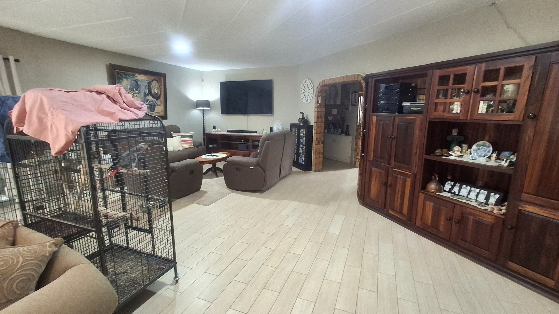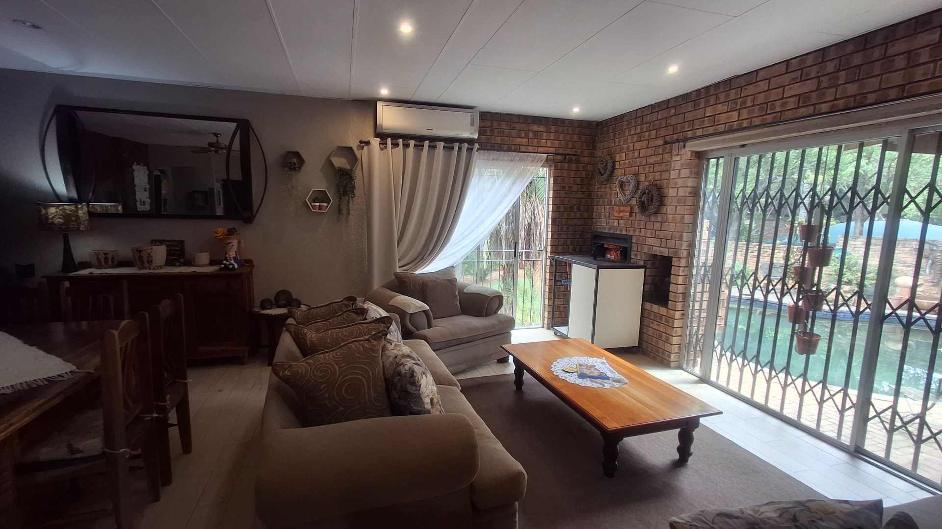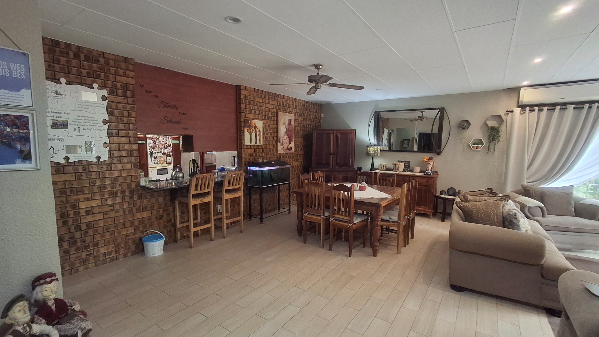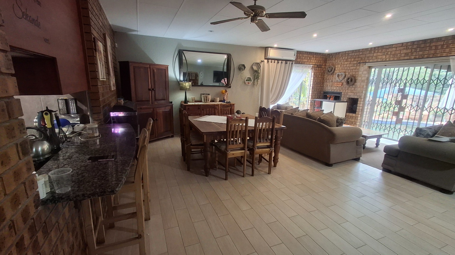 Back to the main house, the interior features a versatile layout with two distinct lounges and two dining areas, providing flexibility for various family activities. The open-plan living space seamlessly integrates a kitchen bar, dining, and living room, all adorned with practical tiled flooring, brick accent walls, and modern recessed lighting. Climate control is ensured with both air conditioning and ceiling fans in key areas. A dedicated living area offers an indoor braai/fireplace and direct access to the outdoor pool area via large glass sliding doors, secured by robust security gates. The face brick exterior provides for low maintenance requirements.