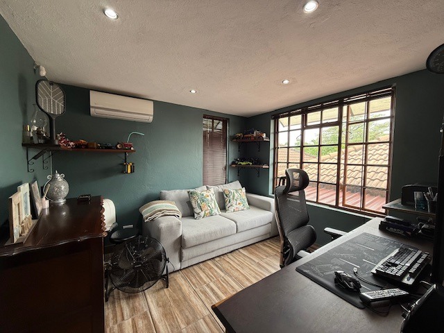 The home offers three spacious bedrooms and two well-appointed bathrooms. As you enter, a dedicated office space welcomes you, providing a perfect work-from-home environment. Ceiling fans and air conditioners throughout the property ensure year-round comfort. An inverter, batteries, and solar panels contribute to energy efficiency, making this home both sustainable and economical.