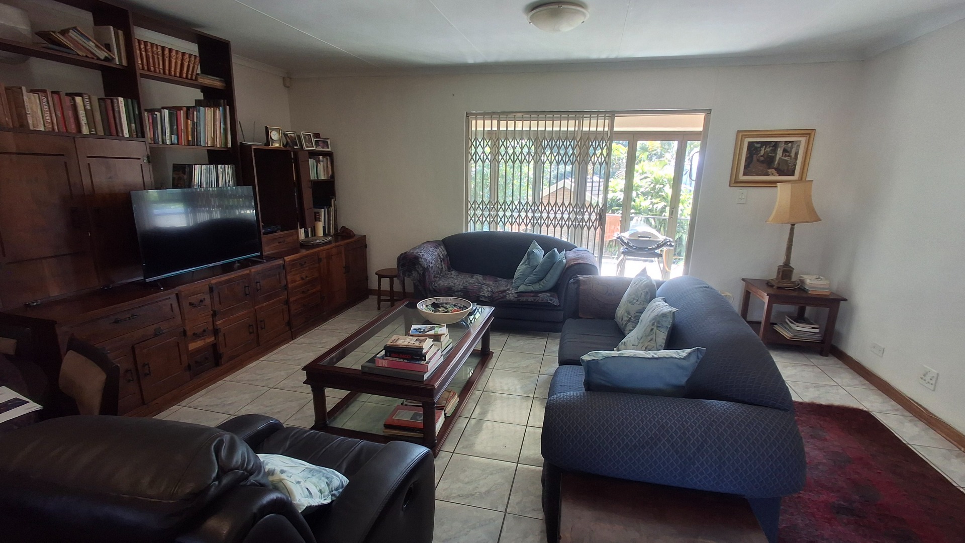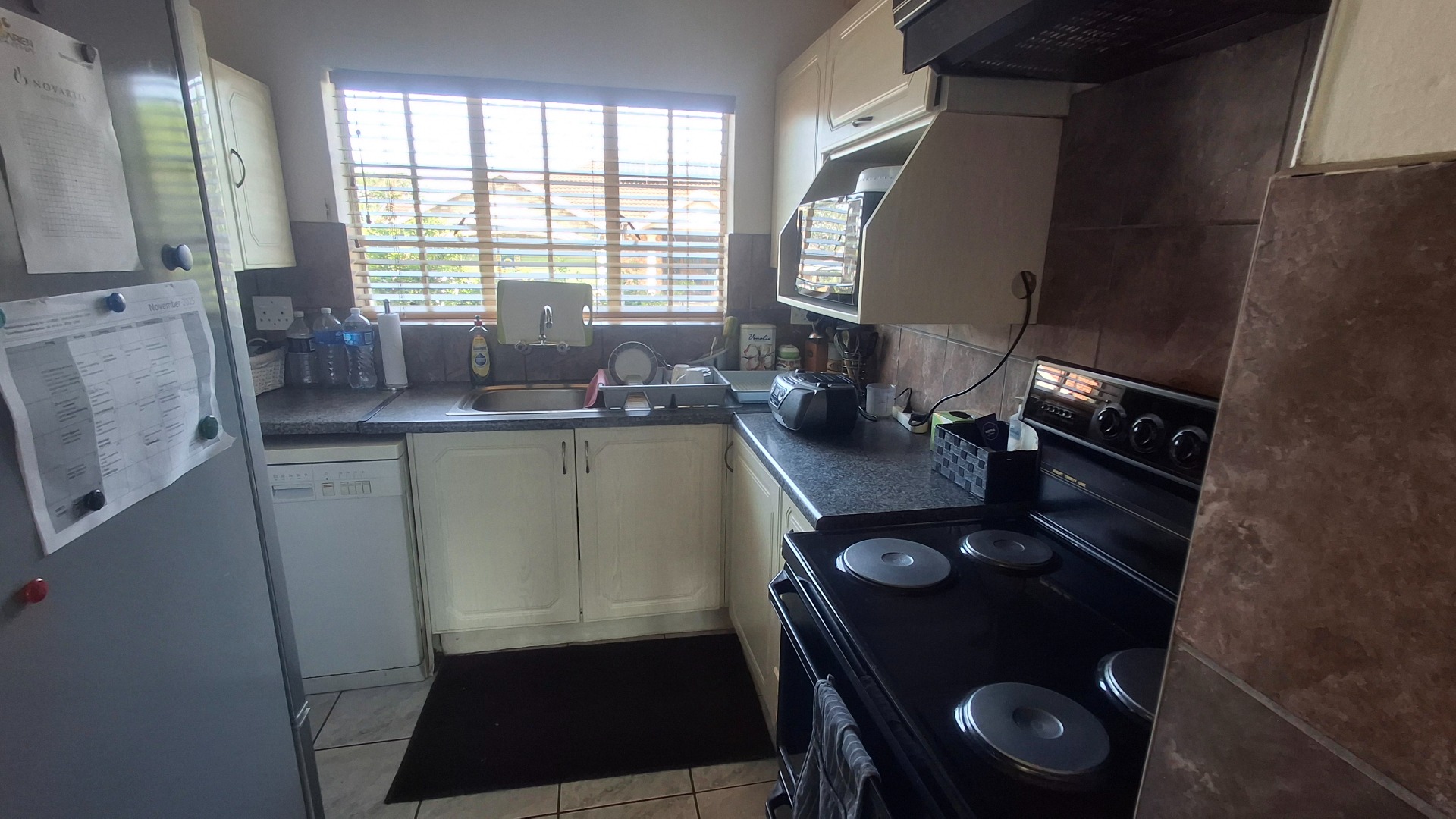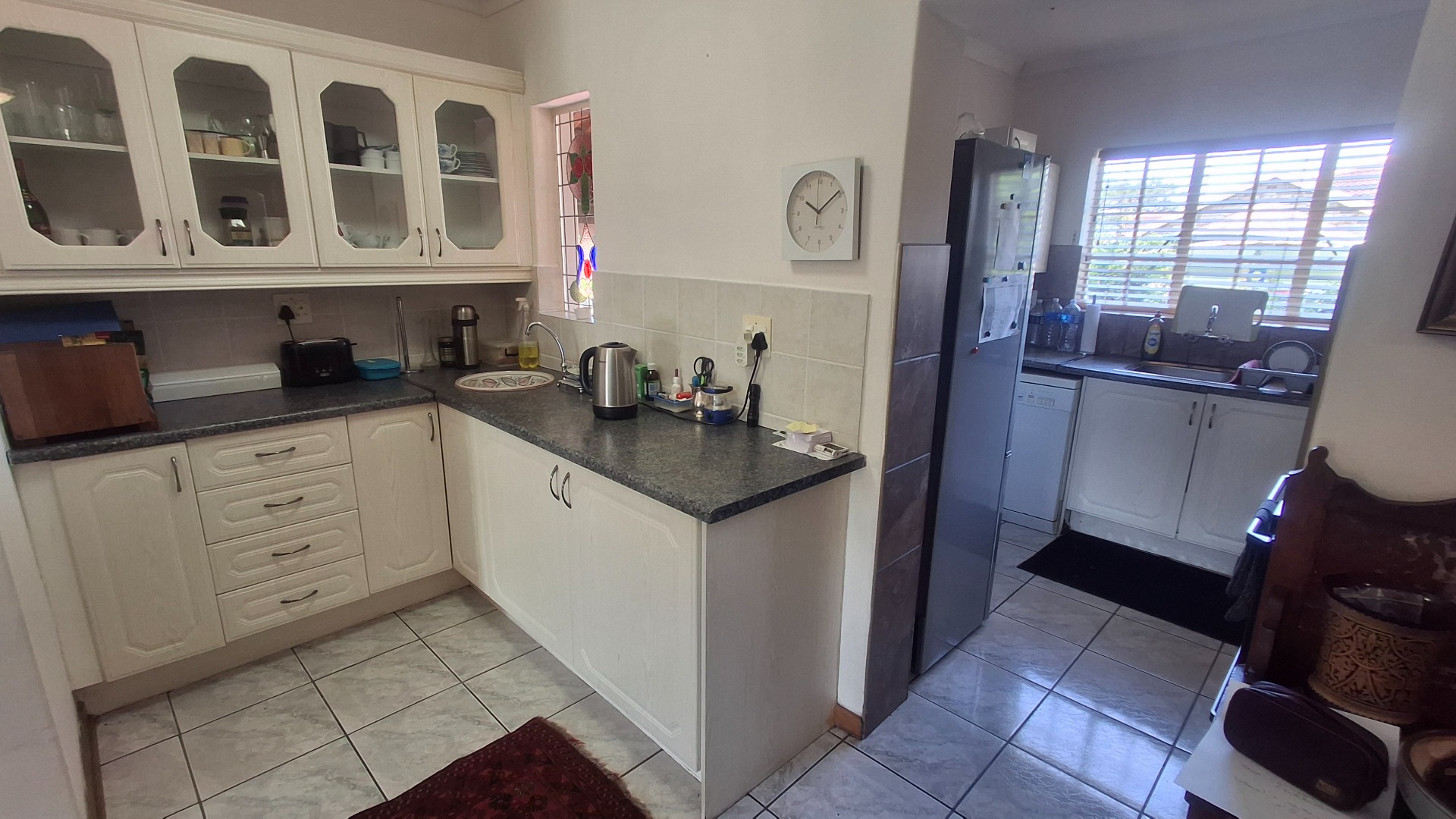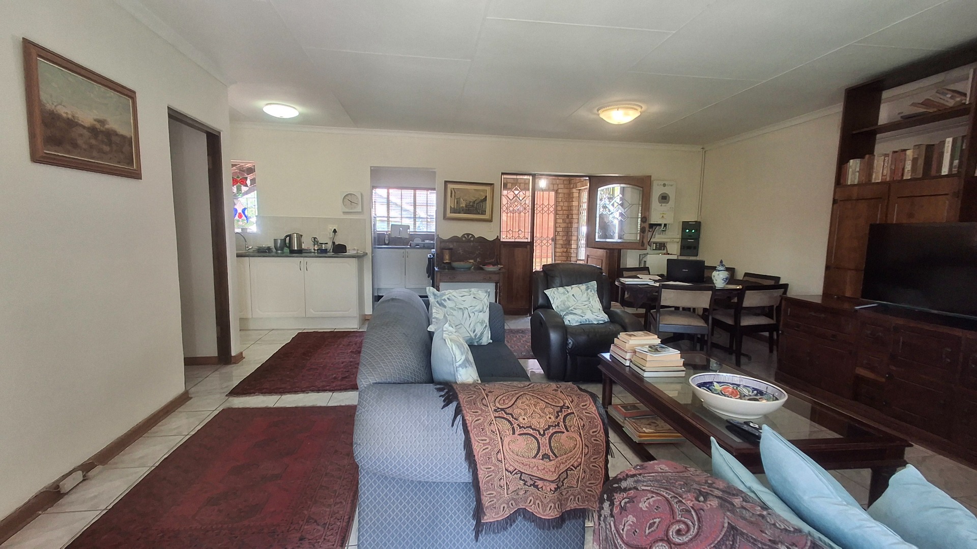 Step inside to an open-plan layout that seamlessly connects the living, dining, and kitchen areas, all adorned with practical tiled flooring. The lounge is bathed in natural light, offering direct access to the outdoor entertainment spaces through large sliding doors, secured with burglar bars and security gates for peace of mind. The functional kitchen is equipped with white cabinetry, generous counter space, and natural light, making it a comfortable hub for daily living.