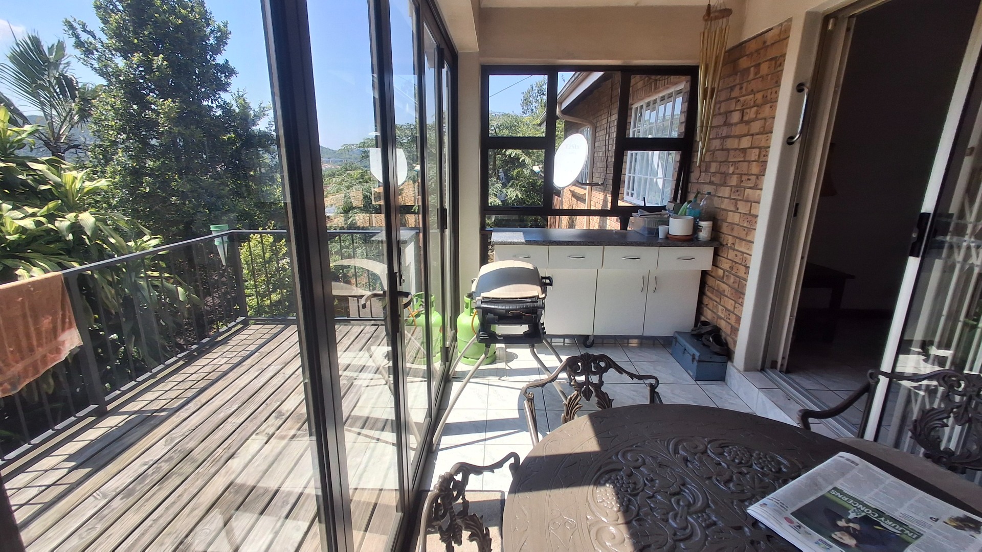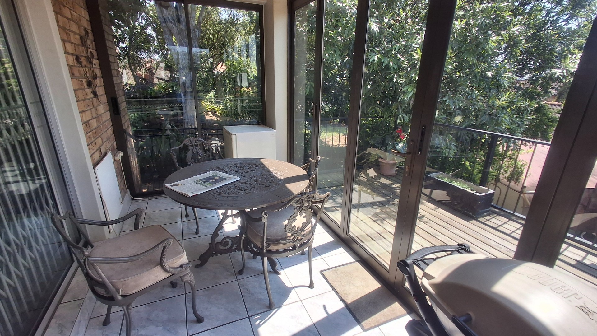 Two of the three bedrooms is complemented by an en-suite bathroom, providing privacy and convenience. The home extends its living space outdoors with an expansive enclosed sunroom/patio, complete with a built-in counter and braai area, perfect for year-round entertaining. Adjacent to this, a spacious wooden deck offers breathtaking green views of the lush surroundings, creating a serene retreat. The established garden benefits from an irrigation system, and pets are welcome.