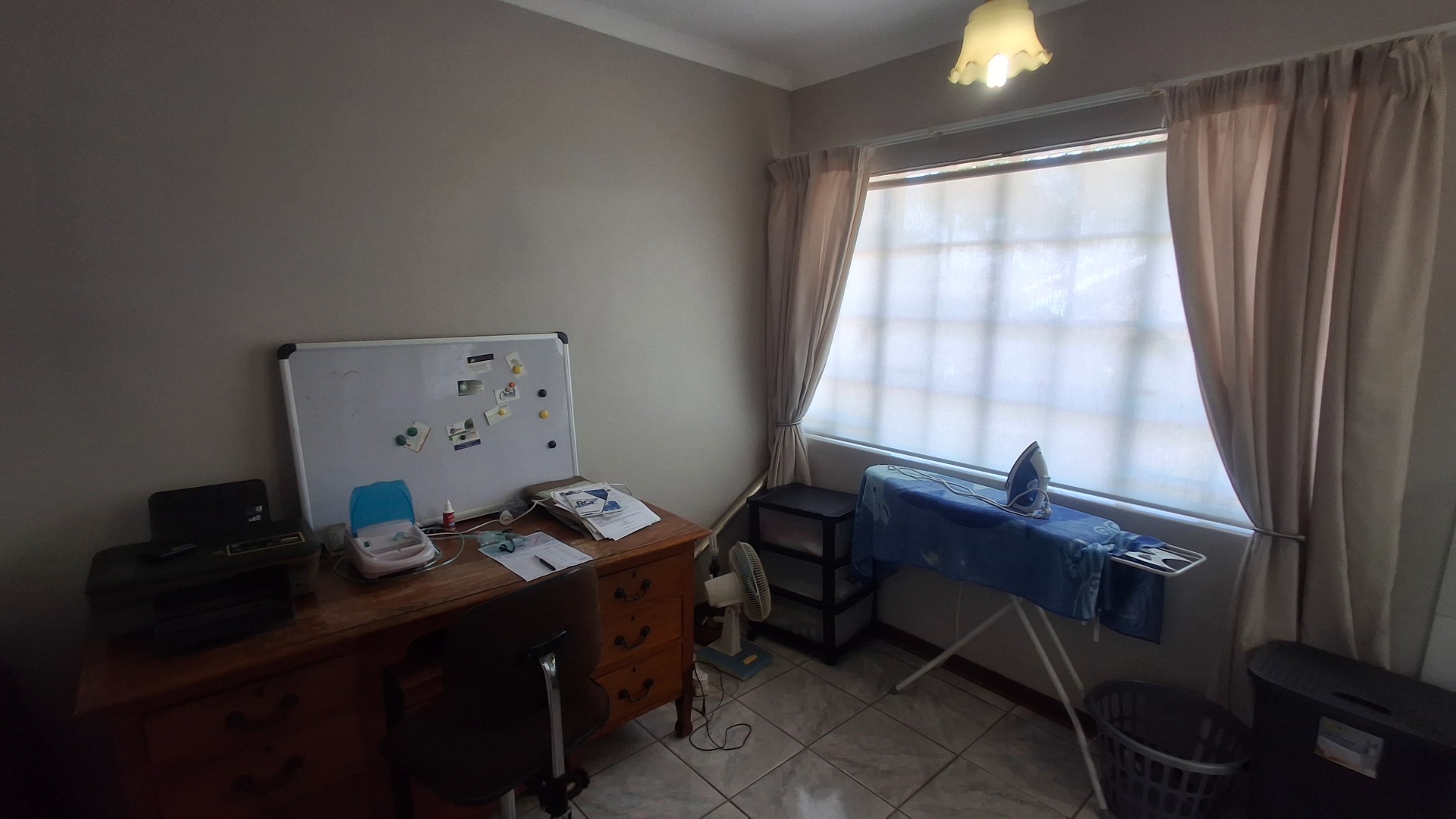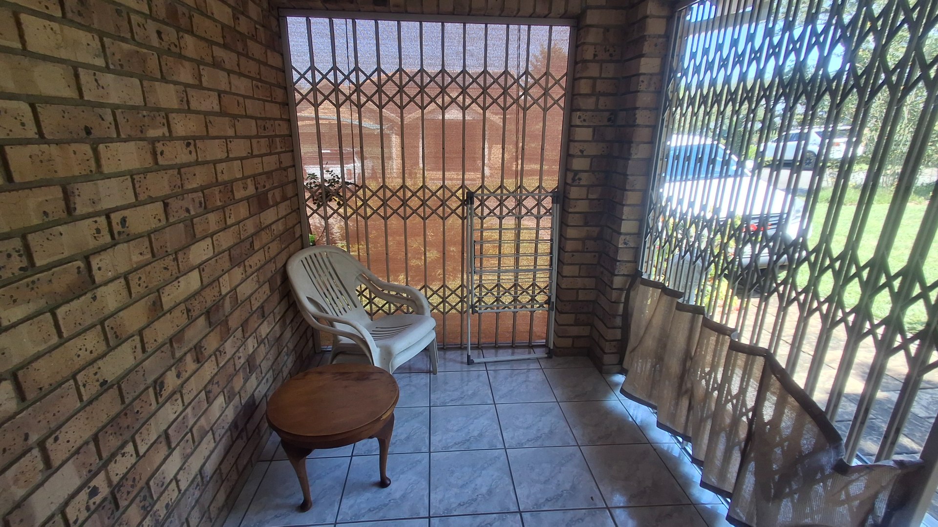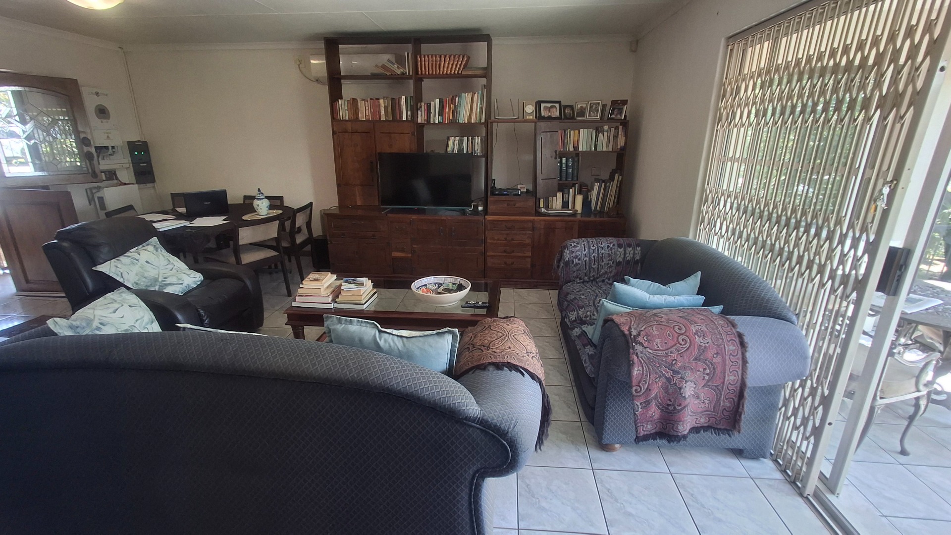Step inside to an open-plan layout that seamlessly connects the living, dining, and kitchen areas, all adorned with practical tiled flooring. The lounge is bathed in natural light, offering direct access to the outdoor entertainment spaces through large sliding doors, secured with burglar bars and security gates for peace of mind. The functional kitchen is equipped with white cabinetry, generous counter space, and natural light, making it a comfortable hub for daily living.