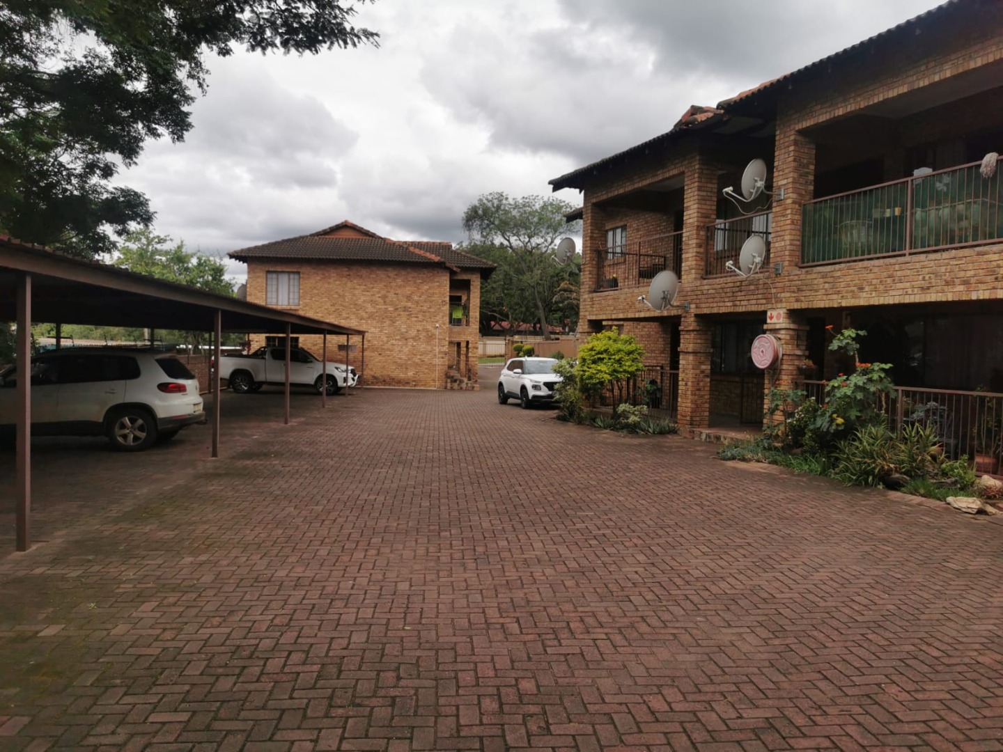 Discover comfortable complex living in this inviting 2-bedroom, 2-bathroom unit located in West Acres, Nelspruit. This 86 sqm property, featuring a durable face brick exterior, offers a practical and secure residential sale opportunity. The building presents a neat kerb appeal with its multi-story design, multiple balconies, and a paved courtyard, complemented by visible covered parking.