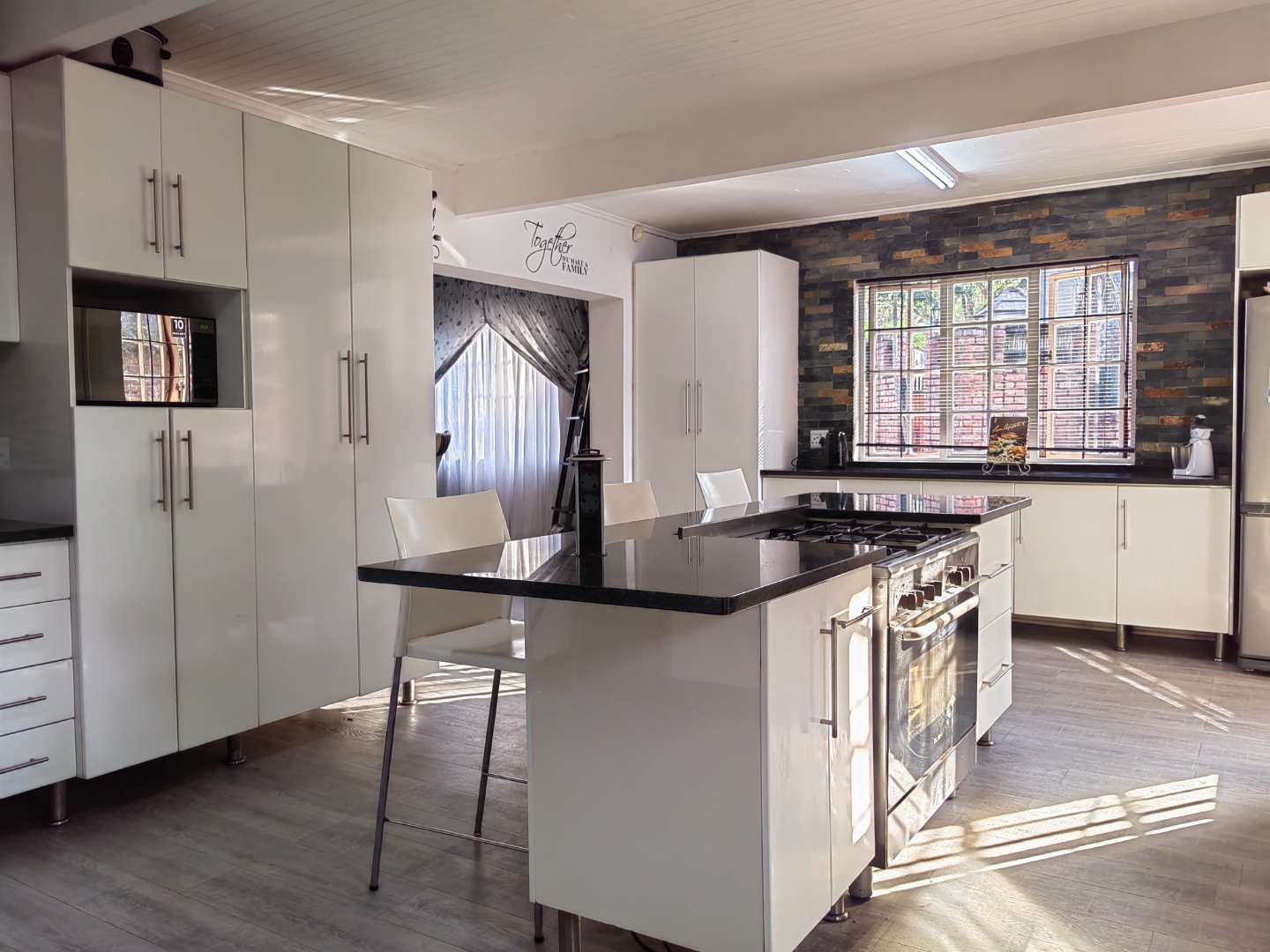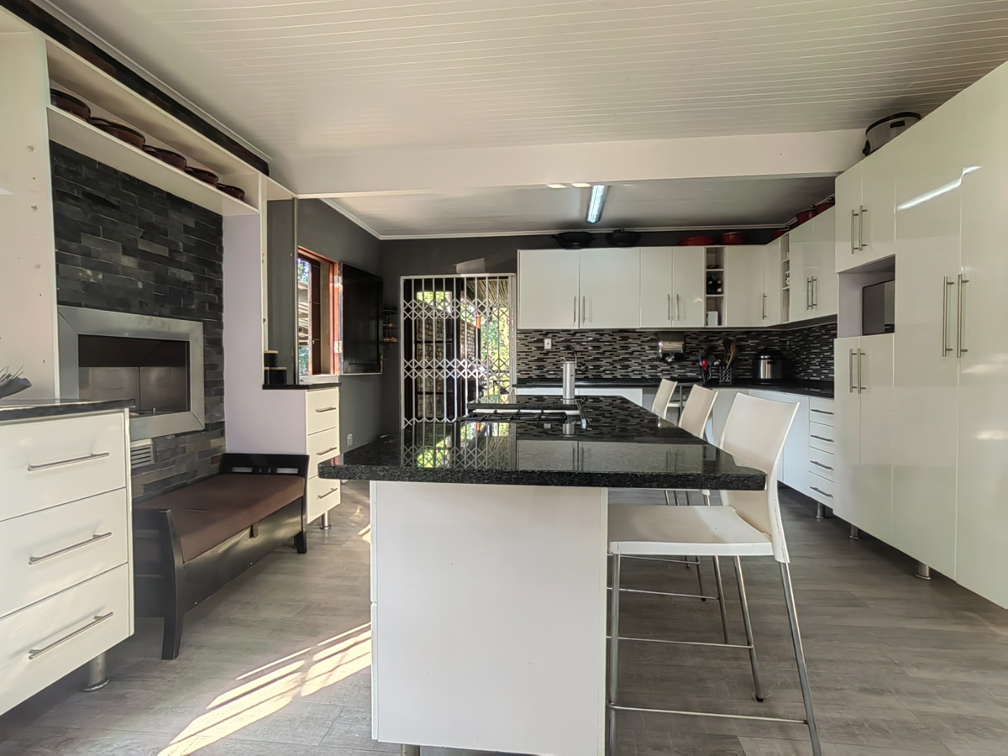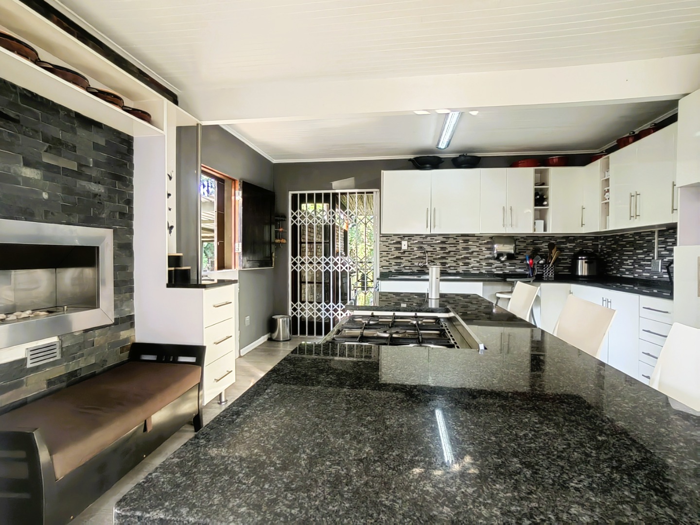 The lovely spacious entertainer's dream kitchen is fitted with ample cupboards and granite counter tops. The family size gas hob is fitted in centre island.