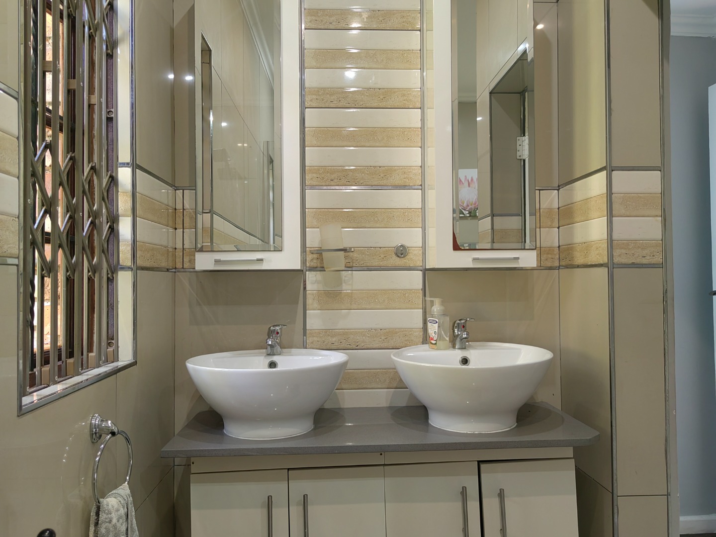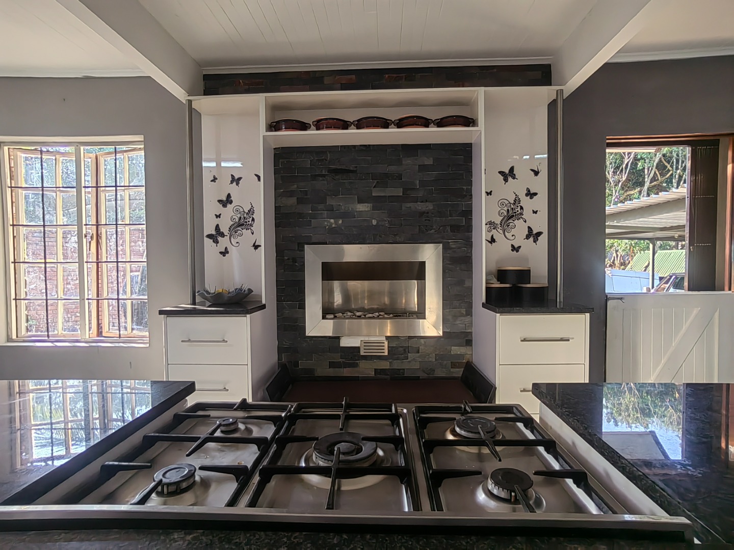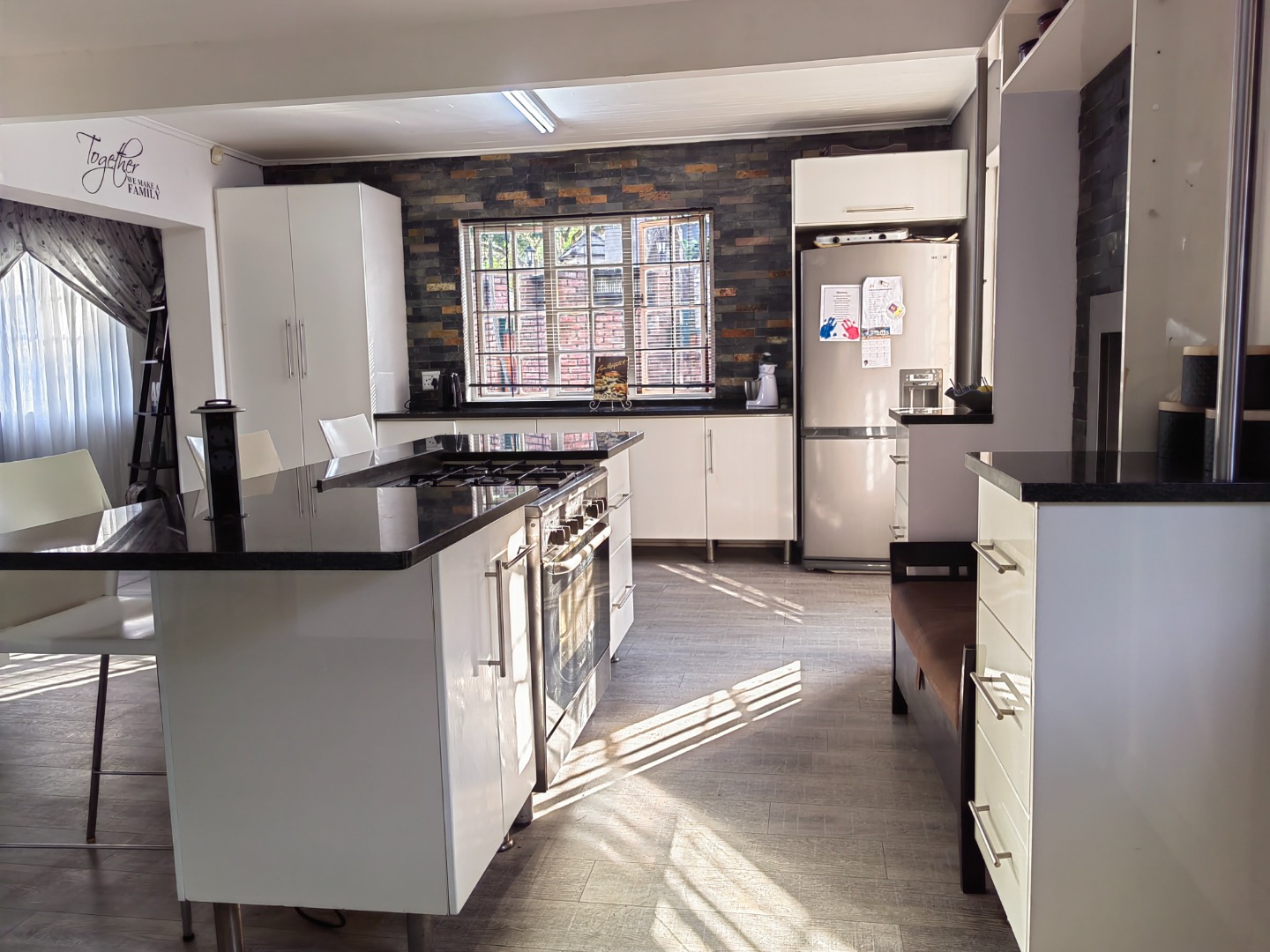 The lovely spacious entertainer's dream kitchen is fitted with ample cupboards and granite counter tops. The family size gas hob is fitted in centre island.